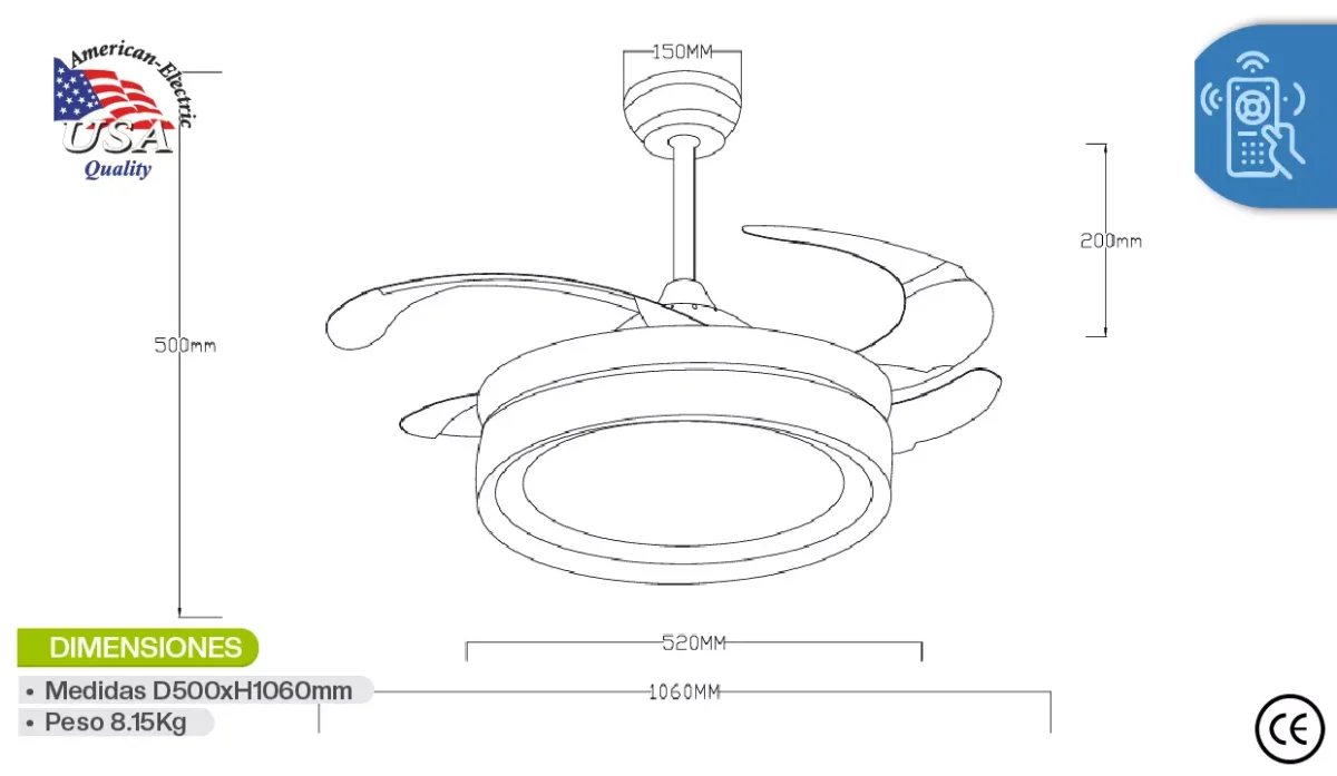 - 106 cm de diámetro con las aspas x 50 cm de alto.