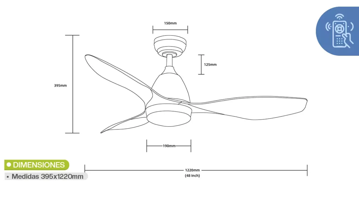 - 48" (122 cm de diámetro) de las aspas x 39,5 cm de alto.