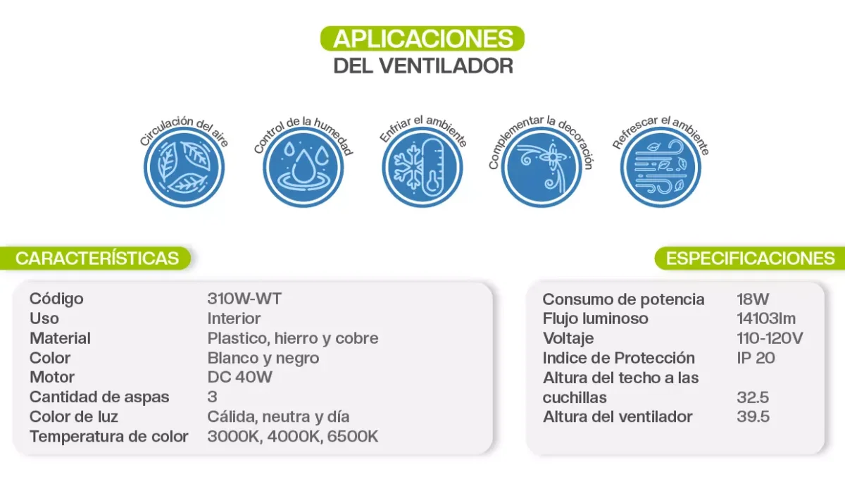 - Nivel de atenuación de luz con 3 intensidades: luz blanca cálida (3000k), luz neutra (4000k) y luz fría o diurna (6000k).