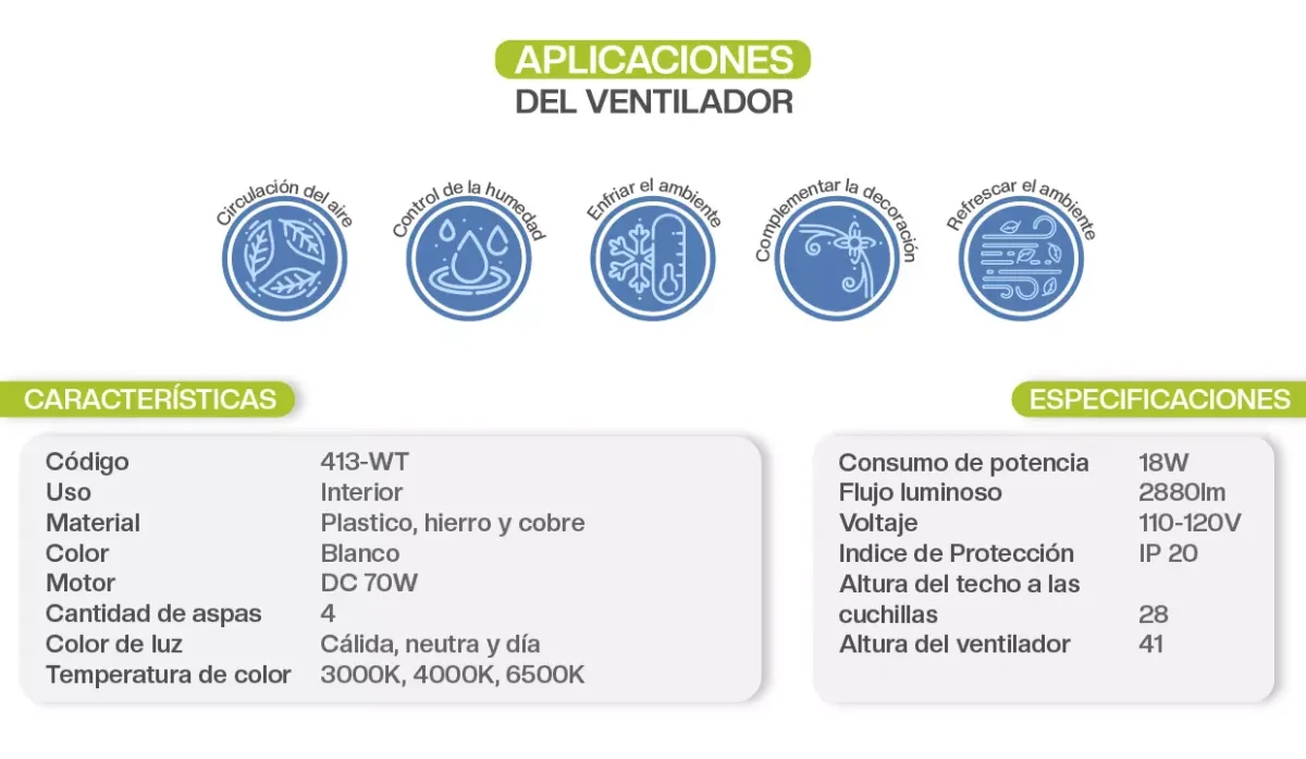 - 106 cm de diámetro con las aspas x 41 cm de alto.