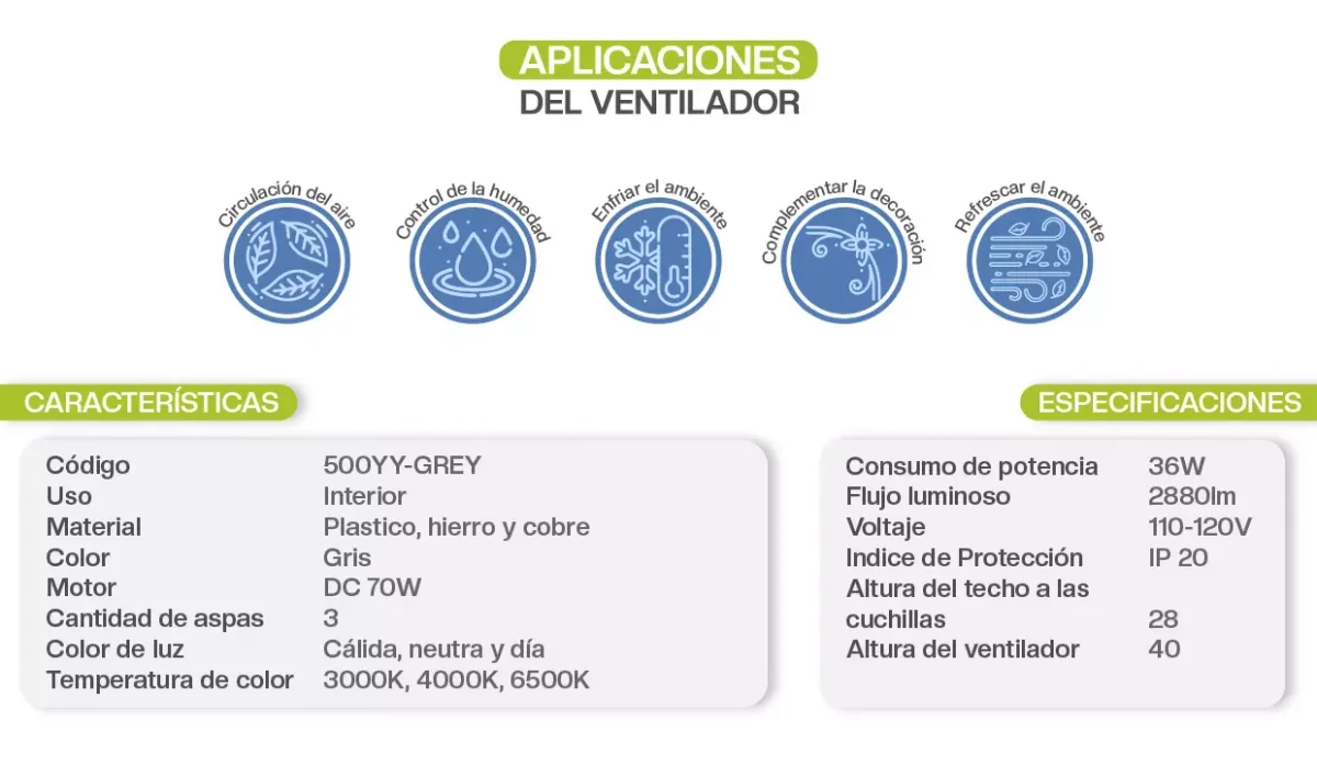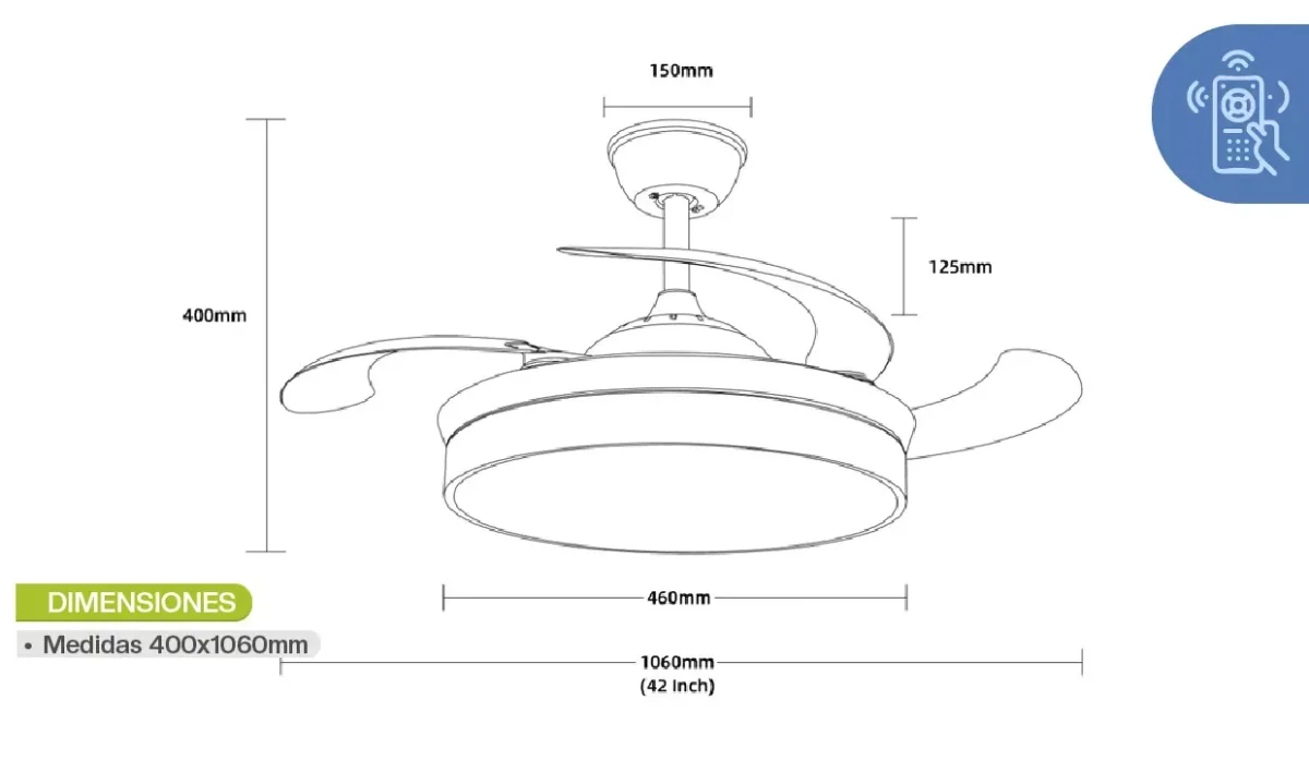 - 106 cm de diámetro con las aspas x 40 cm de alto.