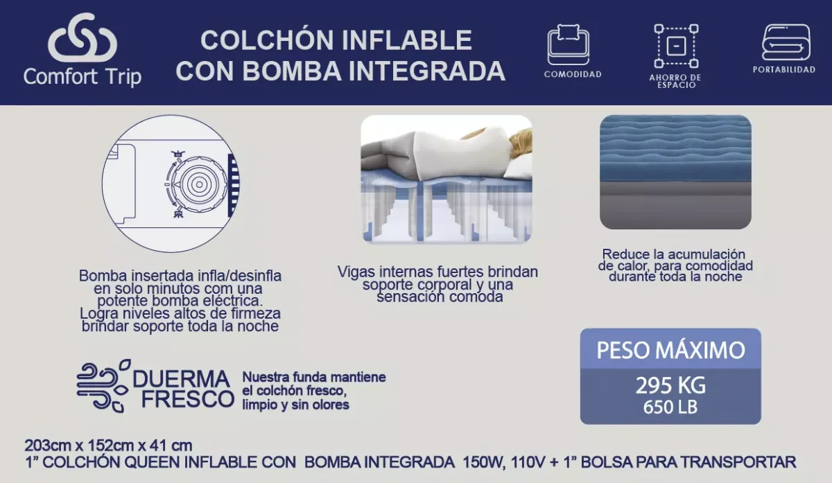 - Con bomba integrada: infla y desinfla en solo minutos.