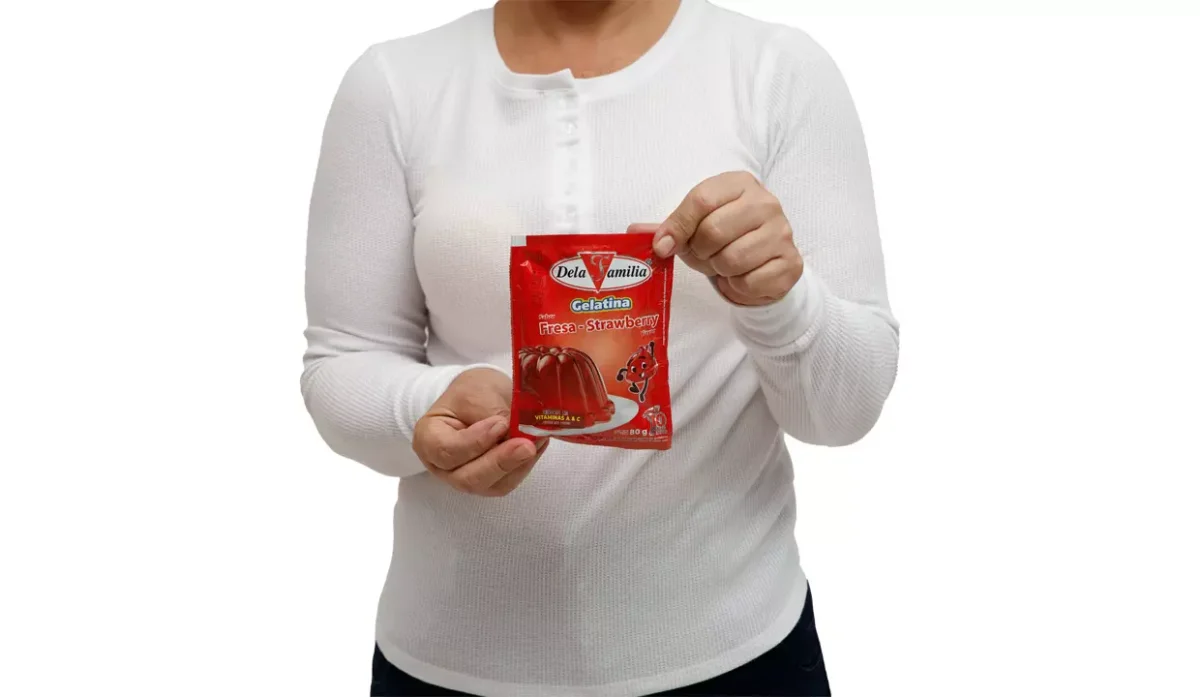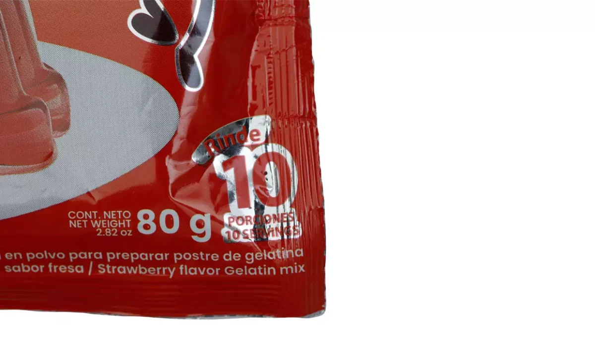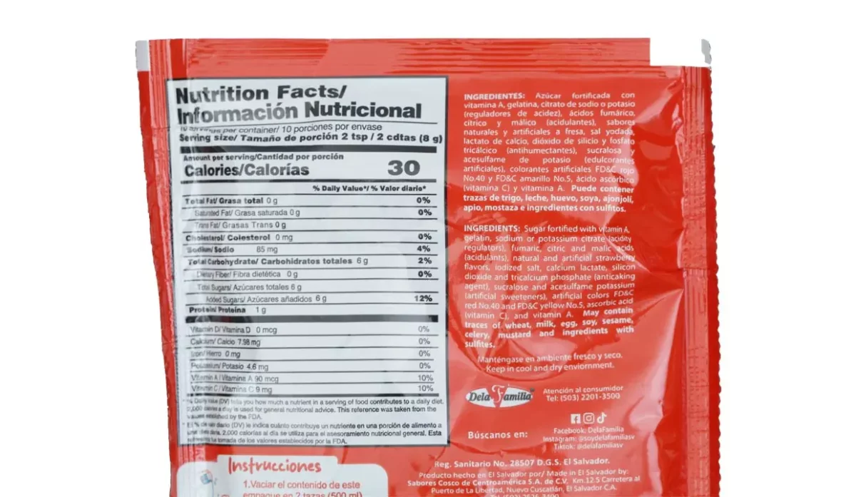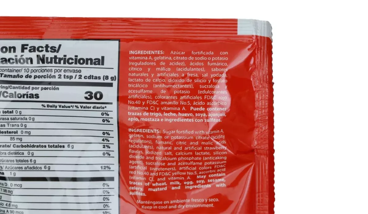 - Azúcar fortificada con vitamina A, gelatina, citrato de sodio o potasio (reguladores de acidez), ácidos fumárico, cítrico y málico (acidulantes), sabores naturales y artificiales a fresa, sal yodada, lactato de calcio, dióxido de silicio y fosfato tricálcico (antihumectantes), sucralosa y acesulfame de potasio (edulcorantes artificiales), colorantes artificiales rojo No40, amarillo No5, ácido ascórbico (vitamina C) y vitamina A.