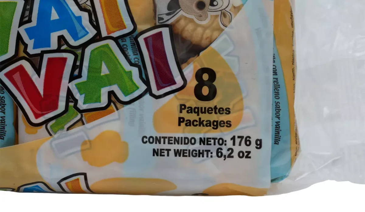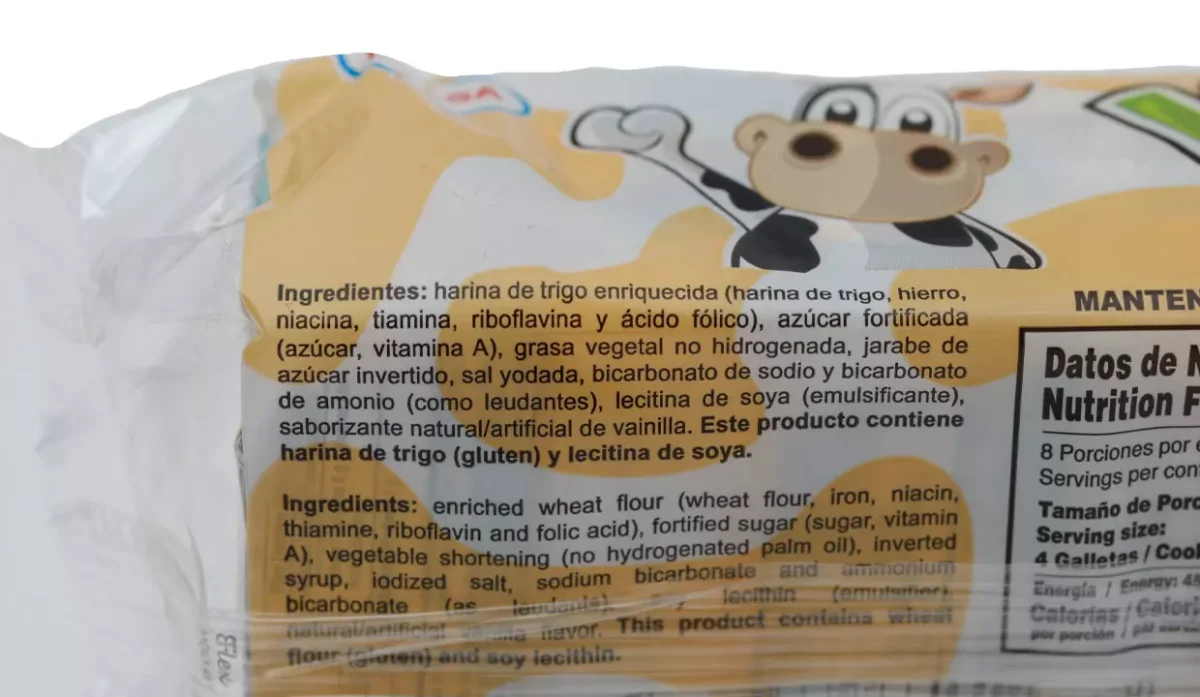 - Harina de trigo enriquecida (harina de trigo, hierro, niacina, tiamina, riboflavina y ácido fólico), azúcar fortificada (azúcar, vitamina A), grasa vegetal no hidrogenada, jarabe azúcar invertido, sal yodada, bicarbonato de sodio y bicarbonato de amonio (como leudantes), lecitina de soya (emulsificante), saborizante neutral/ artificial de vainilla.