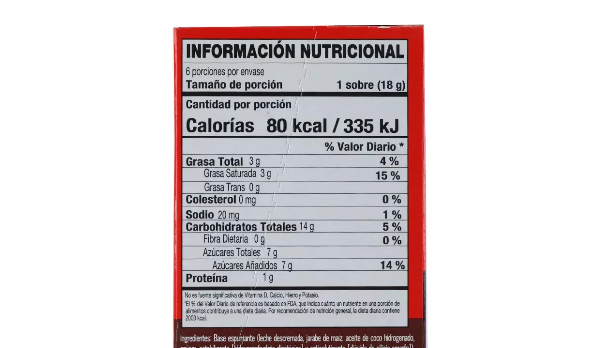 - Base espumante (leche descremada), jarabe de maíz, aceite de coco hidrogenado, azúcar, estabilizante (hidrogenofosfato dipotásico) y antiaglutinante (dióxido de silicio amorfo), crema no láctea (jarabe de maíz, aceite de coco, caseinato de sodio (derivado de leche), estabilizante (hidrogenofosfato dipotásico), emulsionante (mono y diglicéridos de ácidos grasos), colorantes artificiales (dióxido de titanio y betacaroteno), antiglutinante (dióxido de silicio amorfo).