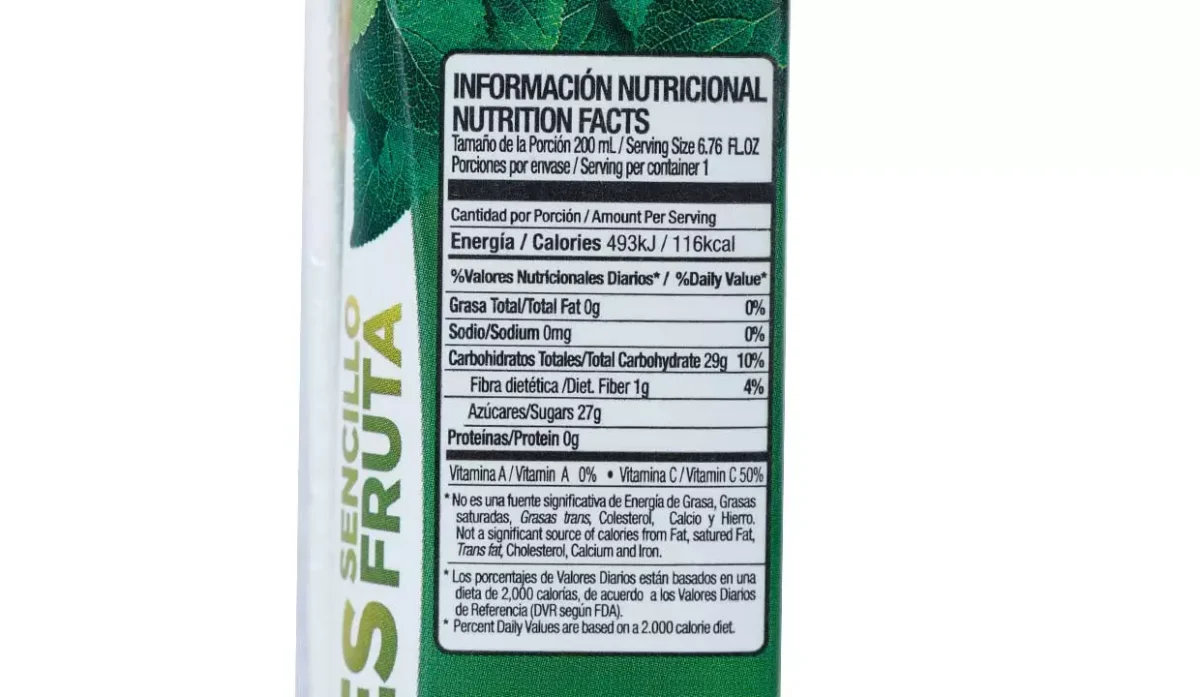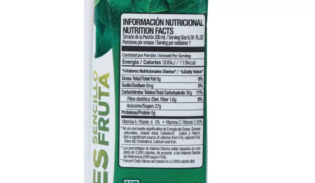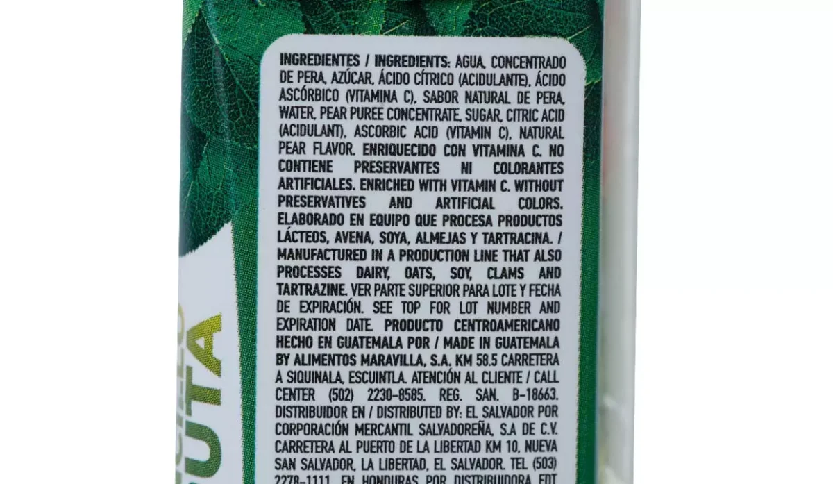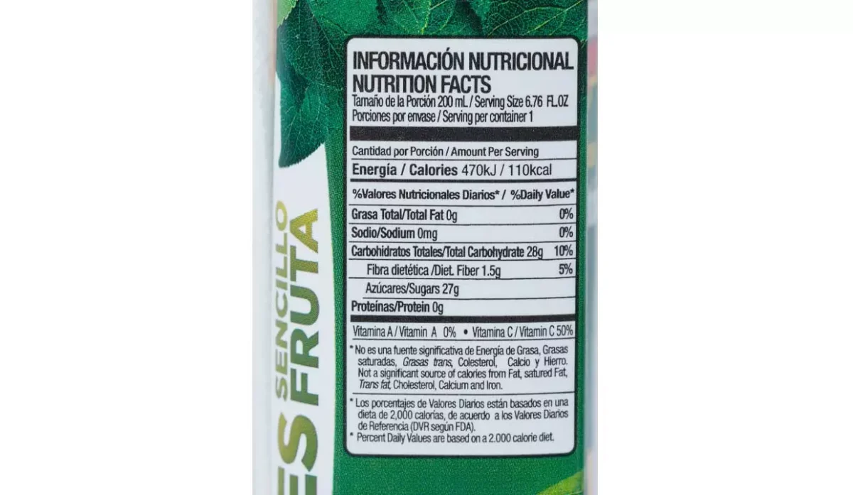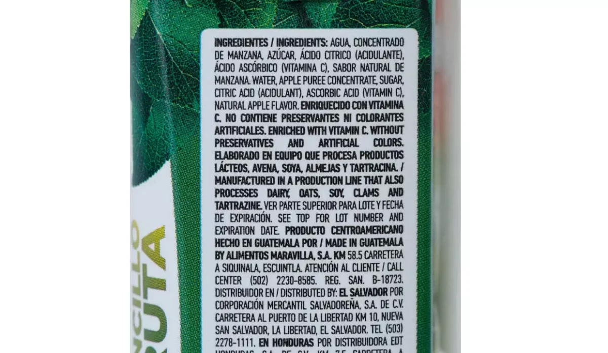 - Agua, concentrado de manzana, azúcar, ácido cítrico (acidulante), ácido ascórbico (vitamina C), sabor natural de manzana.