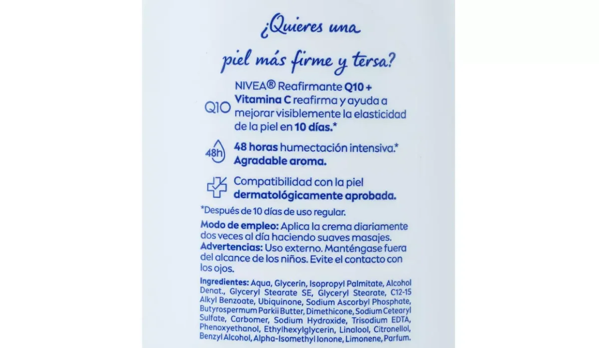 - Crema reafirmante con Q10 más vitamina C reafirma y ayuda a mejorar visiblemente la elasticidad de la piel en 10 días.