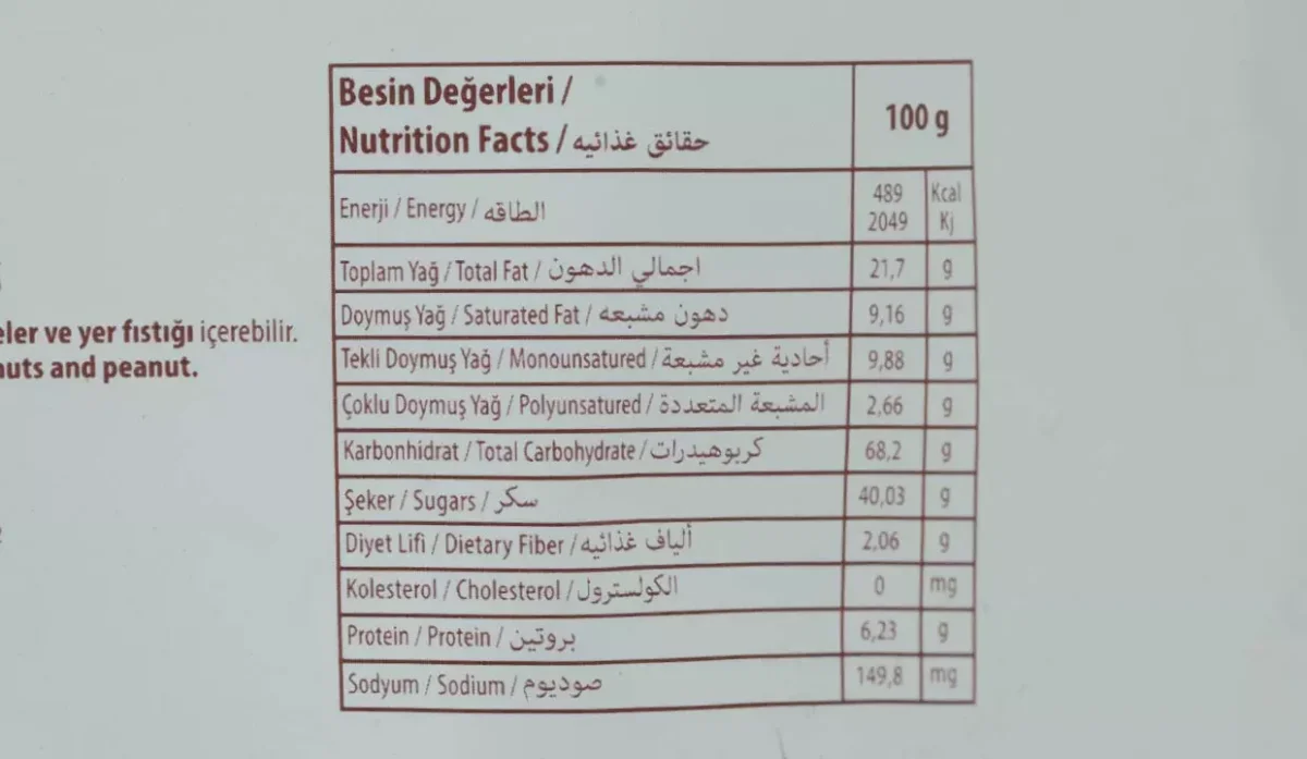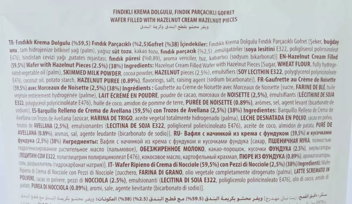 - Oblea rellena de crema de avellanas con trozos de avellana, azúcar, harina de trigo hidrogenada, aceite vegetal (palma), leche desnatada en polvo, cacao en polvo, trozos de avellana 2,5%, emulgentes (lecitina de soja E322), polirricinoleato de poliglicerol E476, aceite de coco, almidón de patata, puré de avellanas 0,89%, aromas, sal, gasificante (bicarbonato sódico).
