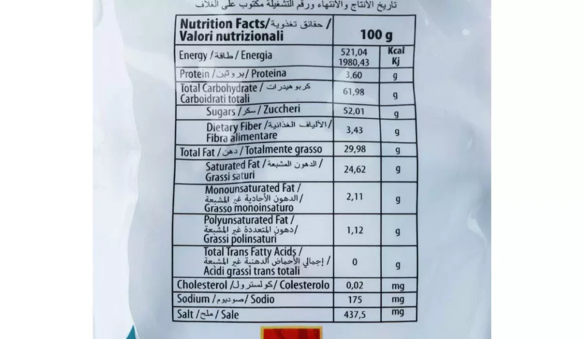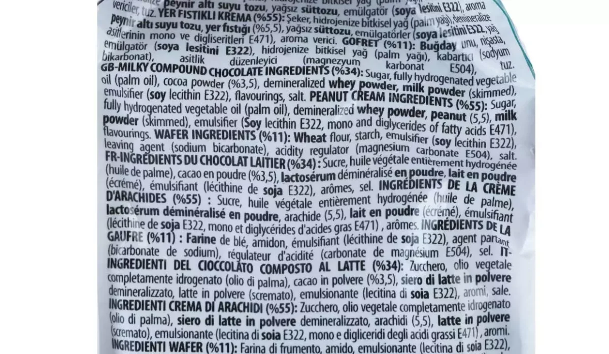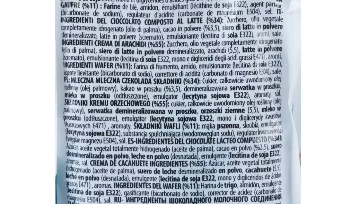 - Chocolate 34%, azúcar, aceite vegetal totalmente hidrogenado (aceite de palma), cacao en polvo 3,5%, suero desmineralizado en polvo, leche en polvo (desnatada), emulgente (lecitina de soja E322), aromas, crema de maní salada 55%, mono y diglicéridos de ácidos grasos E471, aromas, oblea 11%, harina de trigo, almidón, emulgente, lecitina de soja E322, gasificante, bicarbonato de sodio, regulador de acidez, carbonato de magnesio E504.