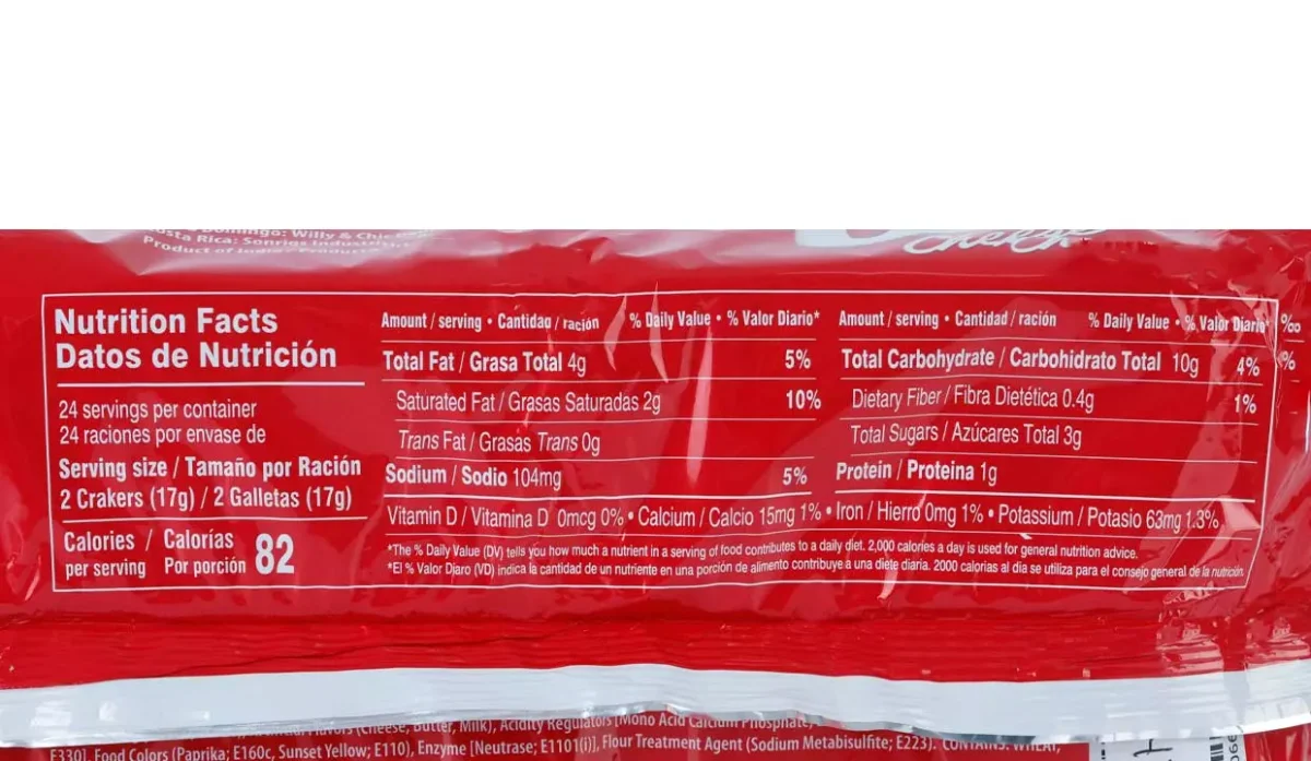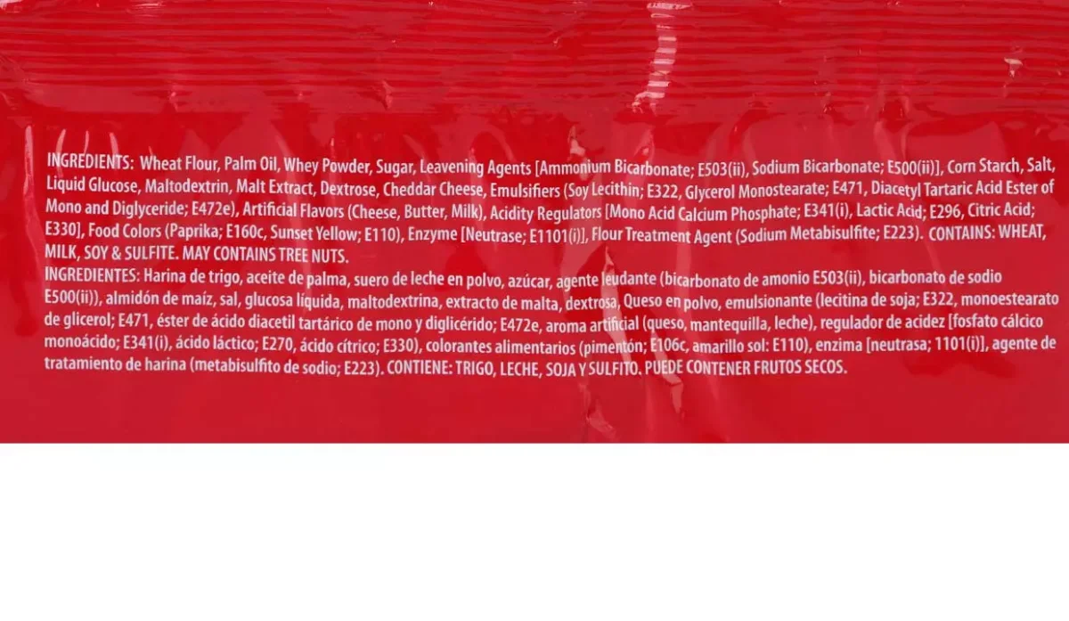 - Harina de trigo, aceite de palma, suero de leche en polvo, azúcar, agente leudante (bicarbonato de amonio E503i, bicarbonato de sodio E500ii), almidón de maíz, sal, glucosa líquida, maltodextrina, extracto de malta, dextrosa, queso en polvo, emulsionante (lecitina de soya, E322, monoesteararto de glicerol, E471, éster de ácido diacetil tartárico de mono y diglicérido, E472e, aroma artificial (queso, mantequilla, leche), regulador de acidez) fosfato cálcico monoácido, E341i, ácido láctico E270.