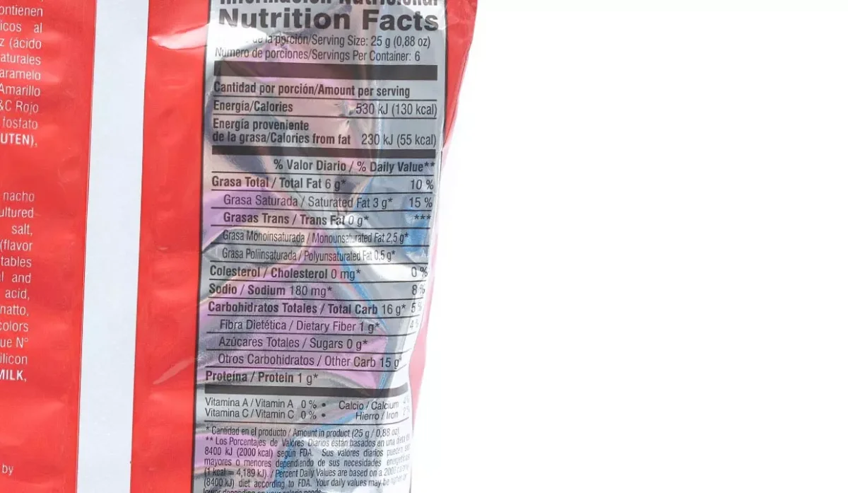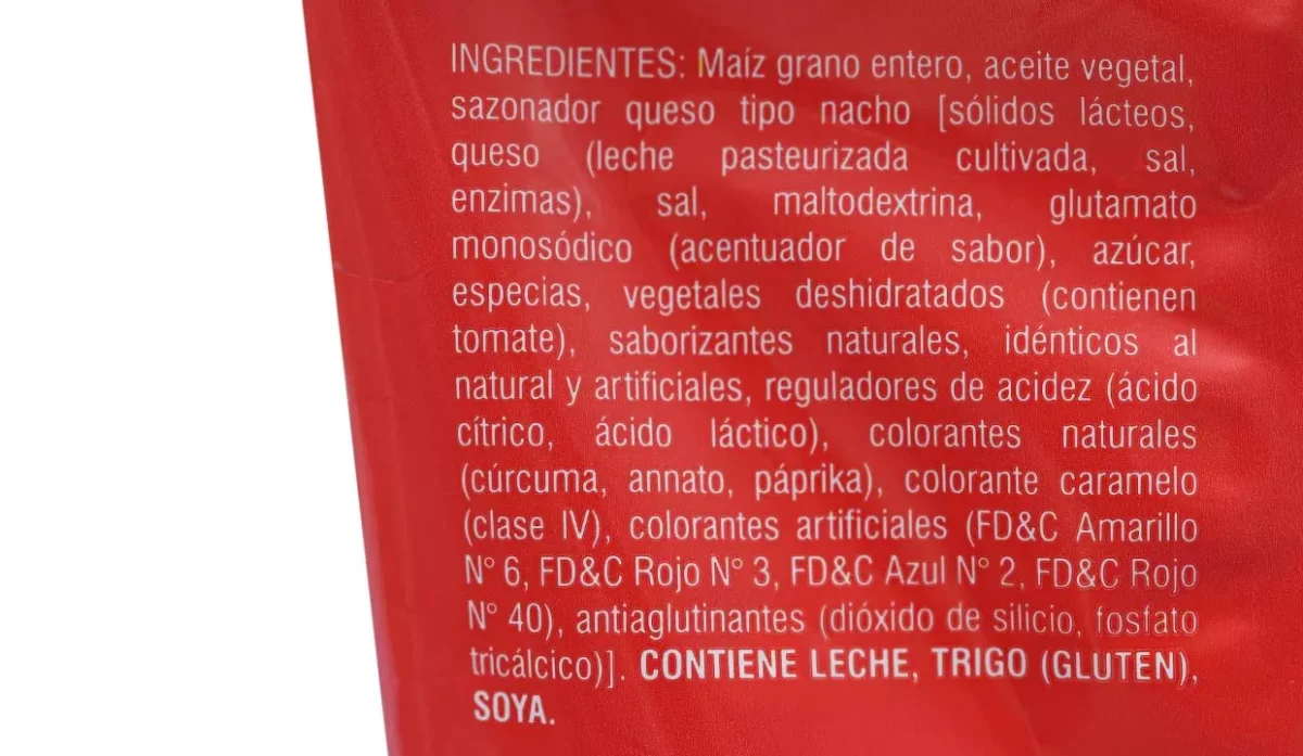 - Maíz grano entero, aceite vegetal, sazonador queso tipo nacho (sólidos lácteos, queso), leche pasteurizada cultivada, sal, enzimas, maltodextrina, glutamato monosódico (acentuador de sabor), azúcar, especias, vegetales deshidratados (contienen tomate), saborizantes naturales, idénticos al natural y artificiales, reguladores de acidez (ácido cítrico, ácido láctico), colorantes naturales (cúrcuma, annato, páprika), colorante caramelo (clase IV), colorantes artificiales (FD&C amarillo N°6.