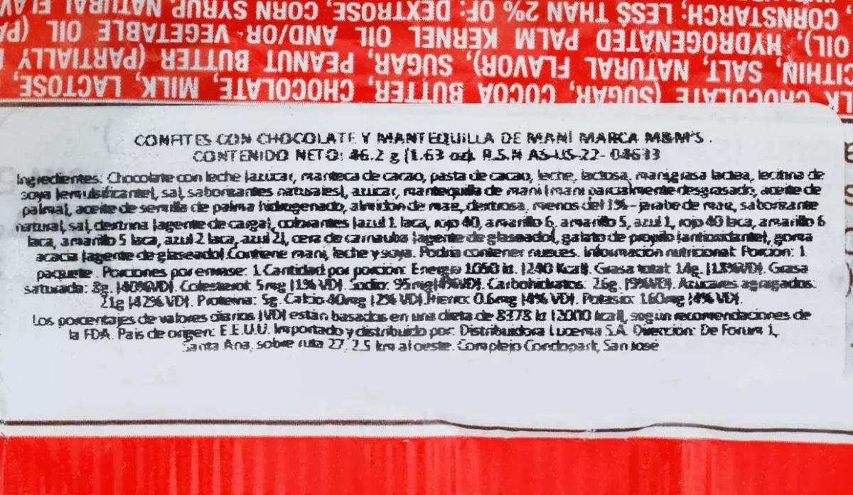 - Chocolate con leche, azúcar, manteca de cacao, pasta de cacao, leche, lactosa, lecitina de soya, sal, saborizantes naturales, azúcar, mantequilla de maní, aceite de semilla de palma, jarabe de maíz, colorantes azul, rojo, amarillo.