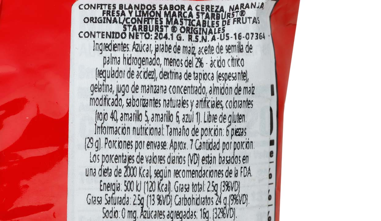 - Azúcar, jarabe de maíz, aceite de semilla de palma hidrogenado, menos de 2%, ácido cítrico (regulador de acidez), textrina de tapioca (espesante), gelatina, jugo de manzana concentrado, almidón de maíz modificado, saborizantes naturales y artificiales, colorantes rojo 40, amarillo 5 y 6, azul 1.