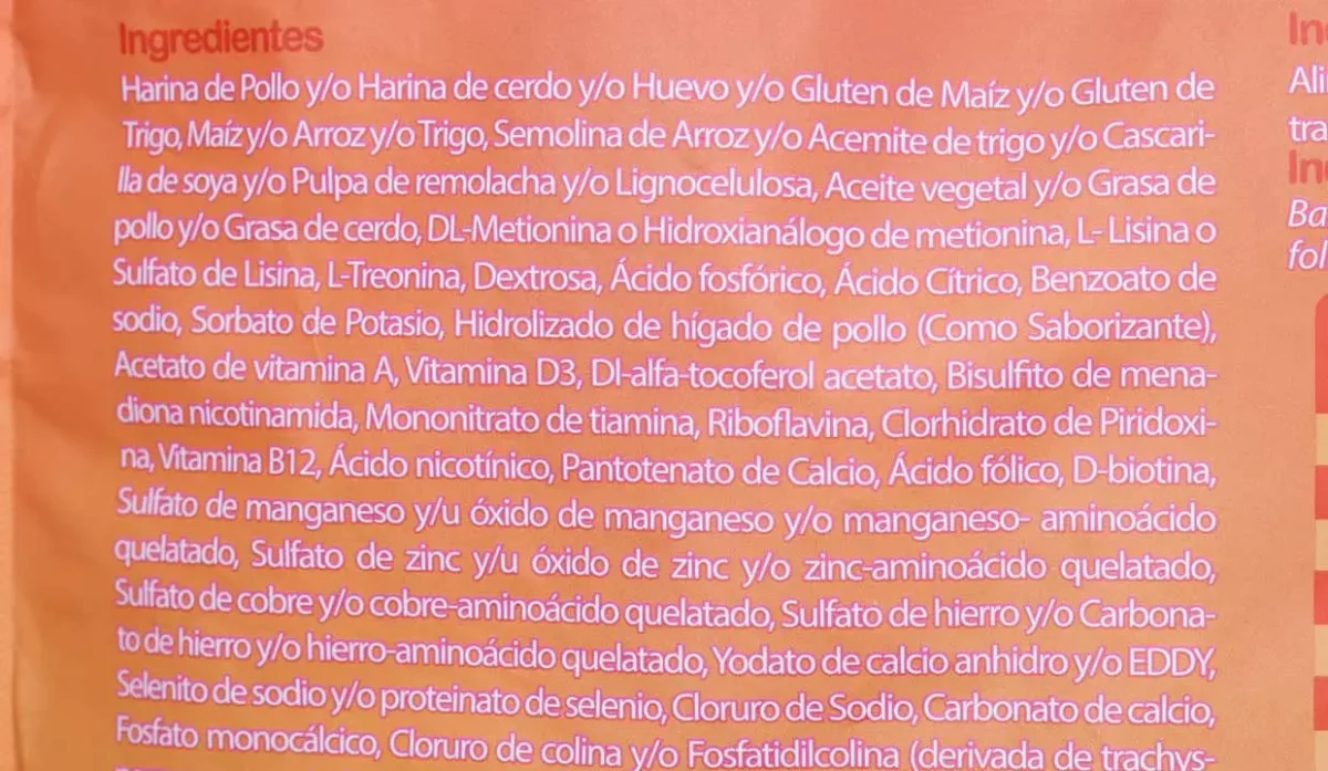 - Harina de pollo y/o harina de cerdo y/o huevo y/o gluten de maíz y/o gluten de trigo, maíz y/o arroz y/o trigo, semolina de arroz y/o acemite de trigo y/o cascarilla de soya y/o pulpa de remolacha y/o lignocelulosa, aceite vegetal y/o grasa de pollo y/o grasa de cerdo, DL-metionina o hidroxianálogo de metionina, L-lisina o sulfato de lisina, L-treonina, dextrosa, ácido fosfórico, ácido cítrico, benzoato de sodio, sorbato de potasio, hidrolizado de hígado de pollo (como saborizante).