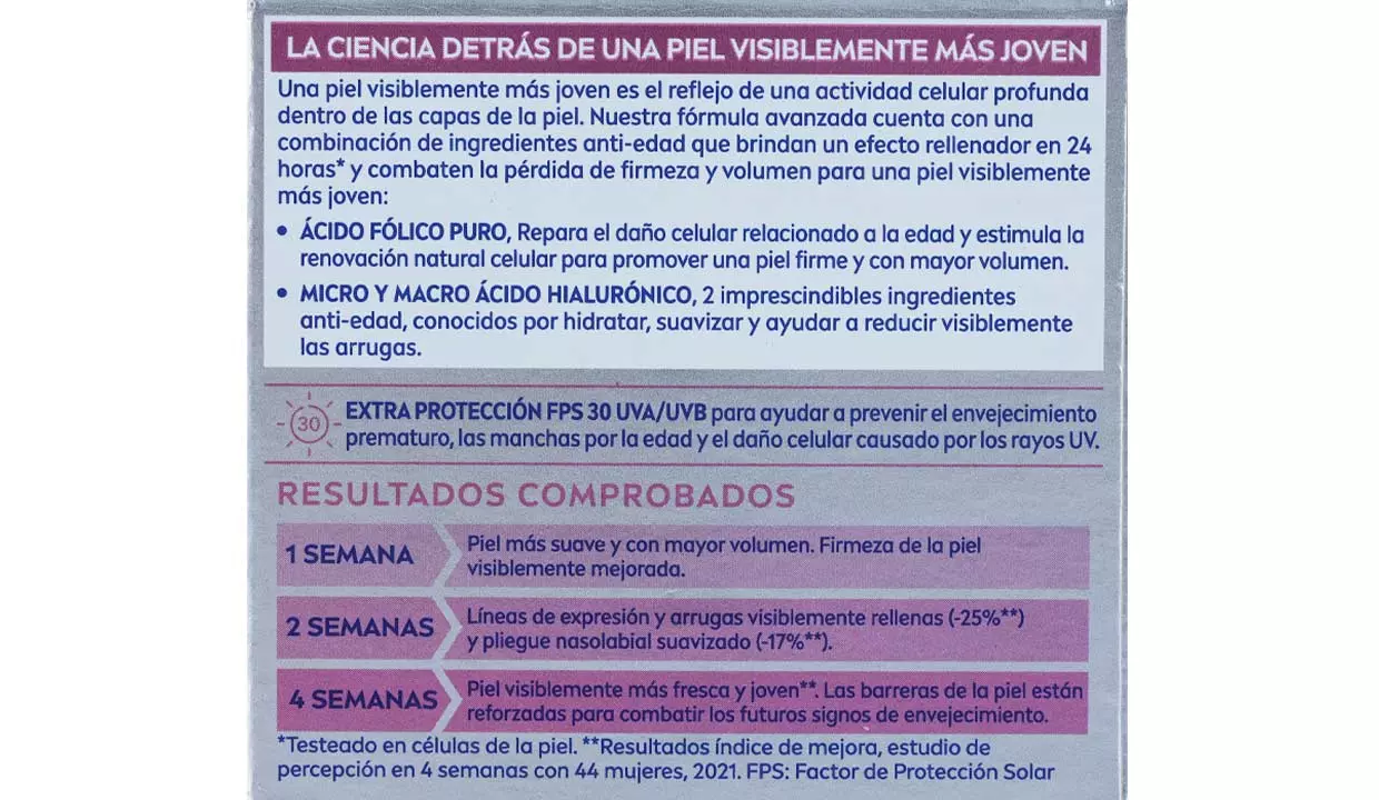 - La fórmula avanzada cuenta con una combinación de ingredientes anti edad que brindan un efecto rellenador en 24 horas.