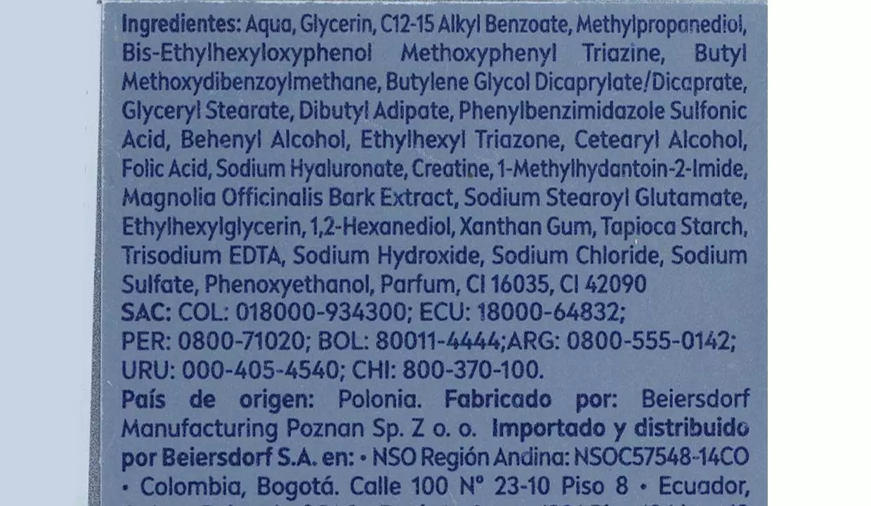 - Agua, glicerina, benzoato de alquilo, metilpropanodiol, bis etihexilaxifenol metoxifenil triazina, butil metoxidibenzoilmetano, dicaprilato de btilenglicol, estearato de dicaprato de glicerilo, adipato de dibutilo, ácido sulfónico de fenilbencimidazol, alcohol behenílico, etilhexilo, trizona, alcohol cetearílico, ácido fólico, hialuronato de sodio, creatina, metilhidantoína, extracto de corteza de imida magnolia officinalis, estearil glutamato de sodio, etilhexilglicerina, hexanodiol, xanthangum.