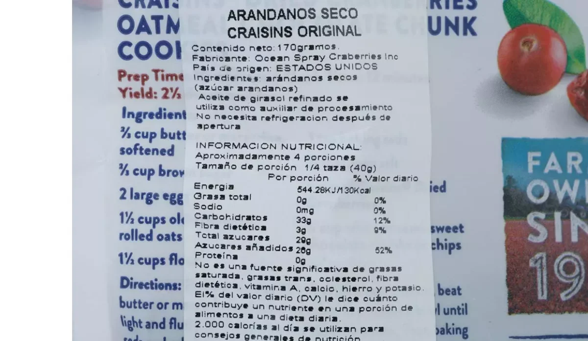 - Arándanos secos, aceite de girasol refinado se utiliza como auxiliar de procesamiento.