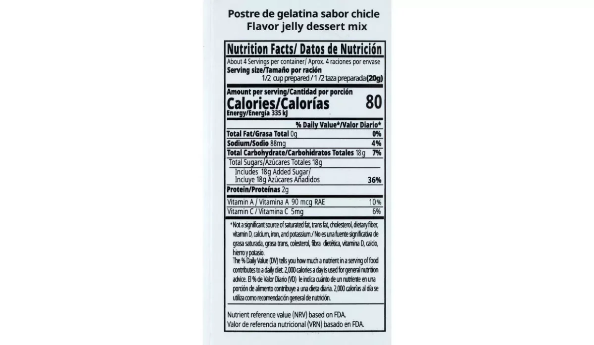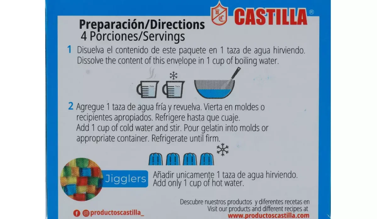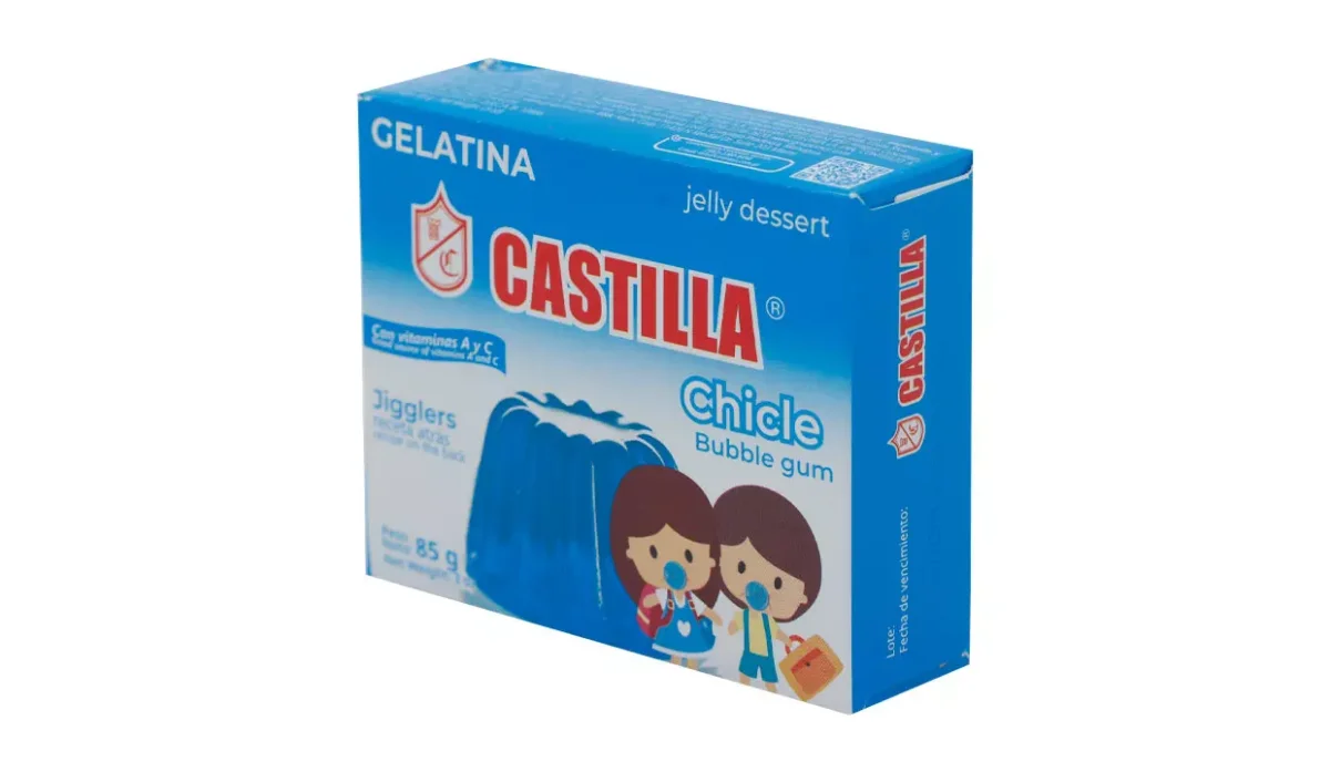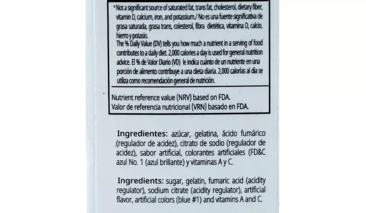 - Azúcar, gelatina, ácido fumárico (regulador de acidez), citrato de sodio (regulador de acidez), sabor artificial, colorantes artificiales azul No1 (brillante) y vitaminas A y C.