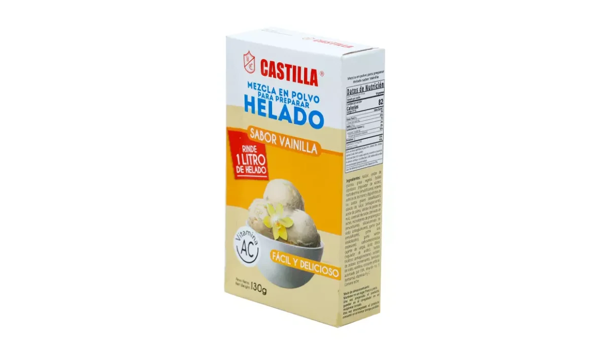 - Carboximetilcelulosa (agente de carga), ácido cítrico (regulador de acidez), fosfato tricálcico (antiaglomerante), sorbato de potasio (conservante), benzoato de sodio, vainilla, colorante artificial, amarillo no5 (tartrazina), vitaminas A y C.