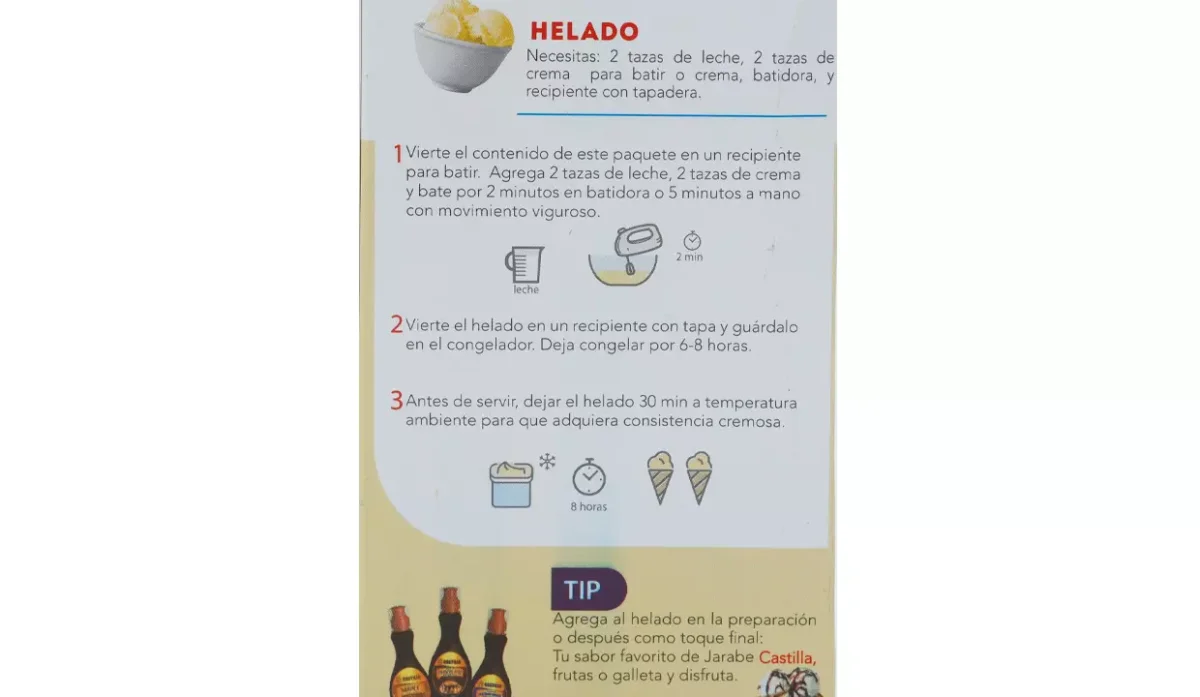 - Vierte el contenido de este paquete en un recipiente para batir, agrega 2 tazas de leche, 2 tazas de crema y bate por 2 minutos en batidora o 5 minutos a mano.