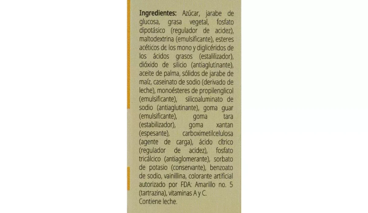 - Azúcar, jarabe de glucosa, grasa vegetal, fosfato dipotásico (regulador de acidez), maltodextrina (emulsificante), esteres acéticos de los mono y diglicéridos de los ácidos grasos (estabilizador), dióxido de silicio (antiaglutinante), aceite de palma, sólidos de jarabe de maíz, caseinato de sodio (derivado de leche), monoésteres de propilenglicol (emulsificante), silicoaluminato de sodio (antiaglutinante), goma guar (emulsificante), goma tara (estabilizador), goma xantan (espesante).