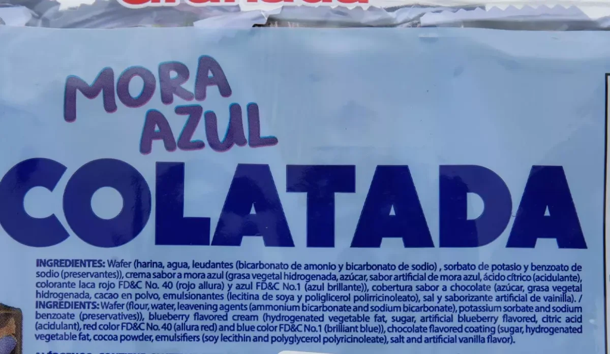 - Harina, agua, leudantes, bicarbonato de amonio y bicarbonato de sodio, sorbato de potasio y benzoato de sodio (preservantes), crema sabor mora azul (grasa vegetal hidrogenada, azúcar, sabor artificial de mora azul, ácido cítrico (acidulante), colorante laca rojo No40 (rojo altura), azul No1 (azul brillante), cobertura sabor a chocolate (cacao en polvo, emulsionantes), lecitina de soya y poliglicerol polirricinoleato, sal y saborizante artificial de vainilla.