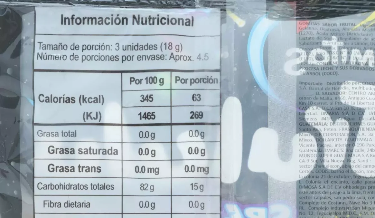 - Jarabe de glucosa, azúcar, agua, gelatina, dextrosa, almidón modificado de papa, ácido láctico (acidulante), ácido málico (acidulante), ácido cítrico (acidulante), lactato de sodio (regulador de acidez), pectina (gelificante), saborizantes artificiales limón, uva, manzana, mora azul, mandarina, fresa, cereza y toronja, colorantes artificiales, amarillo N5 (tartrazina), rojo No40 (altura), amarillo No6 (sunset), azul No1 (azul brillante), ácido fumárico (acidulante).