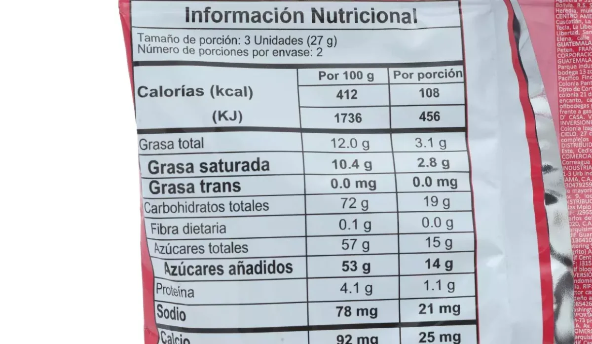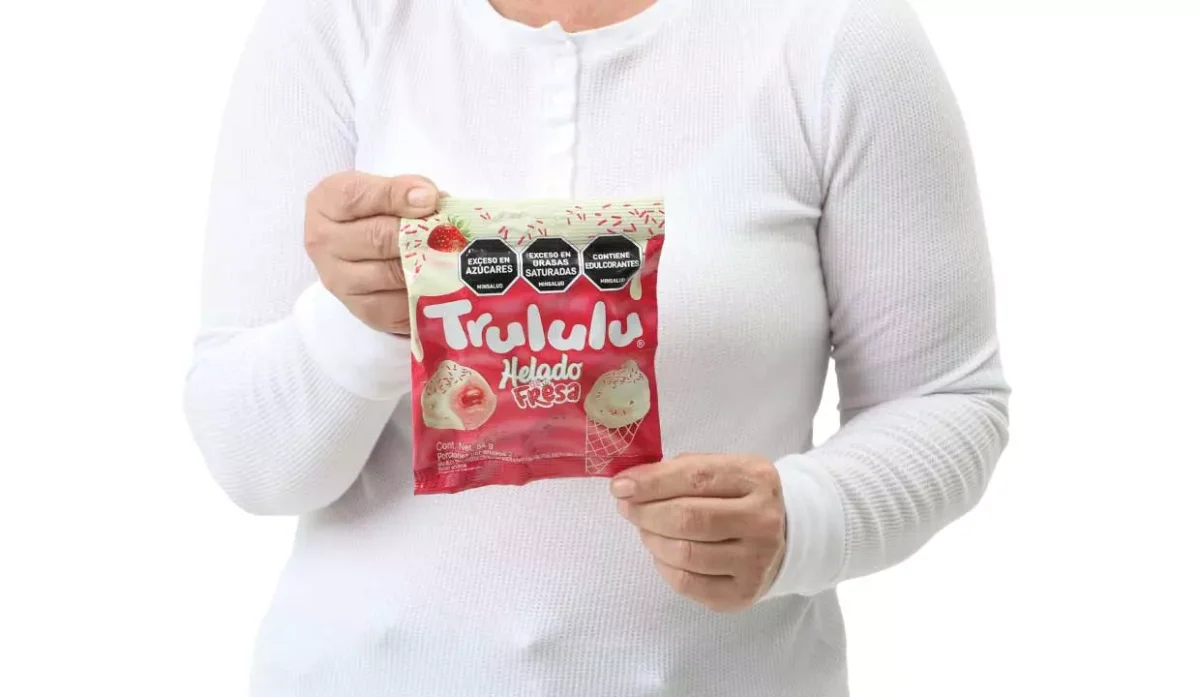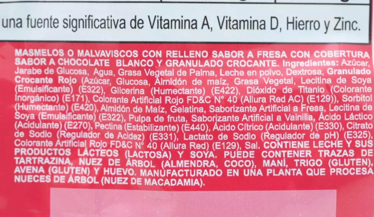- Azúcar, jarabe de glucosa, agua, grasa vegetal de palma, leche en polvo, dextrosa, granulado crocante rojo, glucosa, almidón de maíz, grasa vegetal, lecitina de soya (emulsificante), glicerina (humectante), dióxido de titanio (colorante inorgánico), colorante artificial rojo No40 (altura), sorbitol (acidulante), almidón de maíz, gelatina, saborizante artificial a fresa, lecitina de soya (emulsificante), pulpa de fruta, saborizante artificial a vainilla, ácido láctico (acidulante).