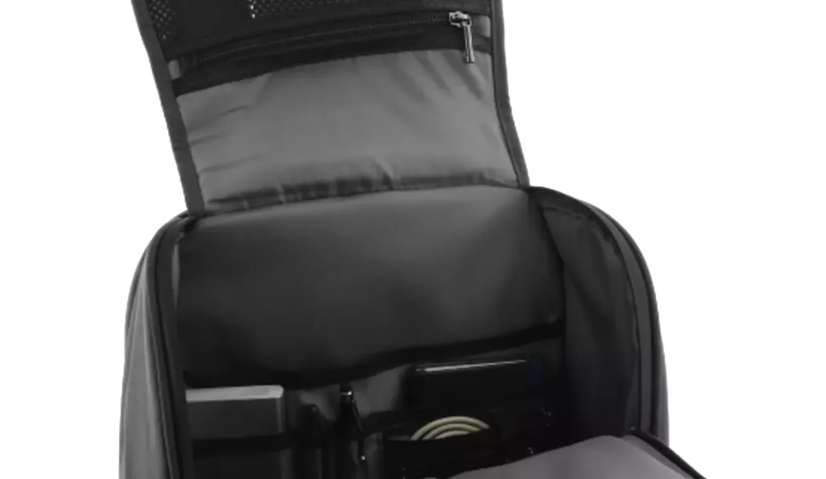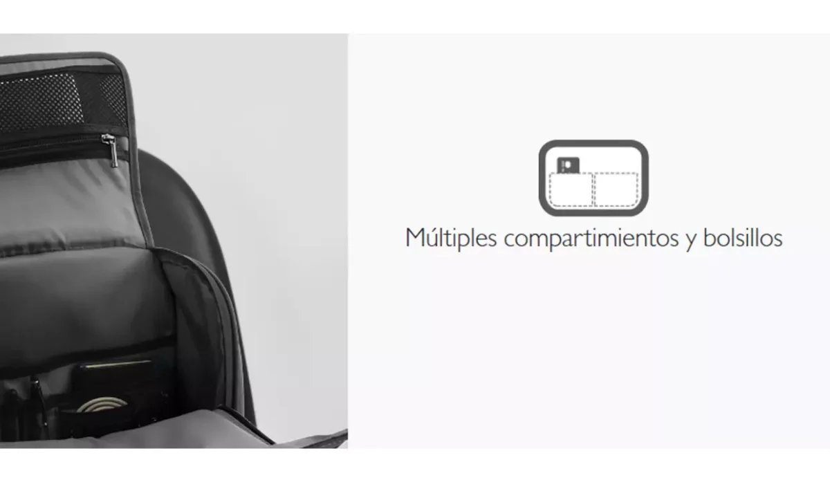 - Organizadores internos y en el bolsillo de malla con cierre para almacenar cables, cargadores, gafas, artículos de librería, llaves, etc.