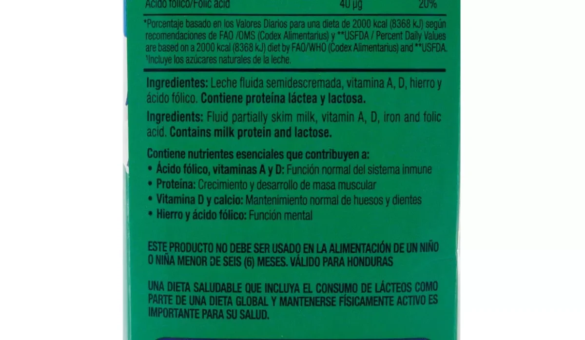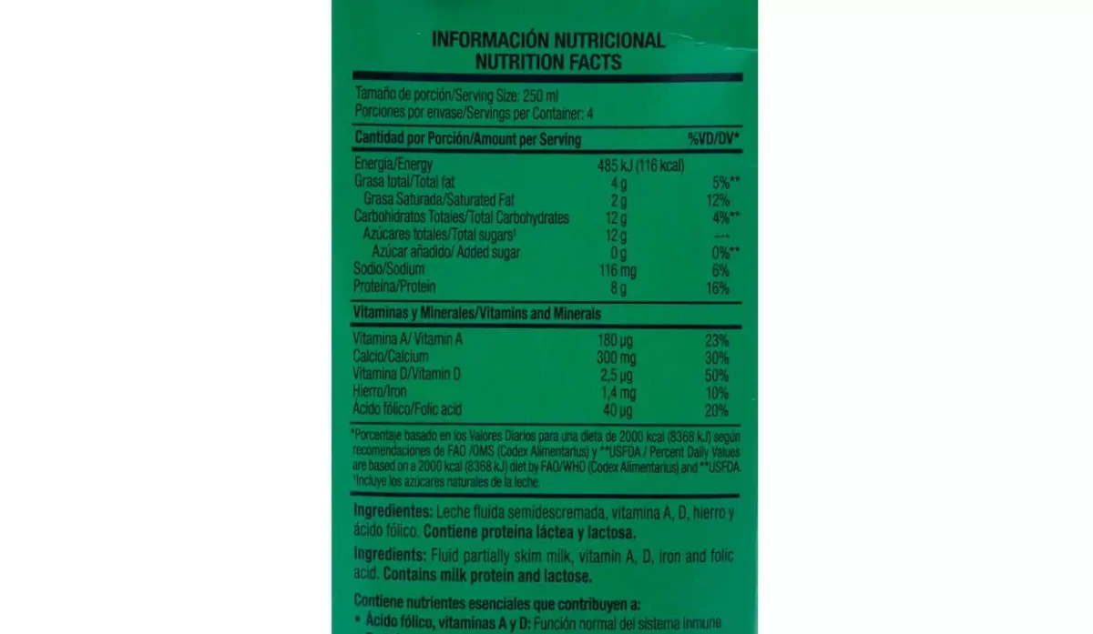 - Leche fluida semidescremada, vitamina A,D, hierro y ácido fólico.