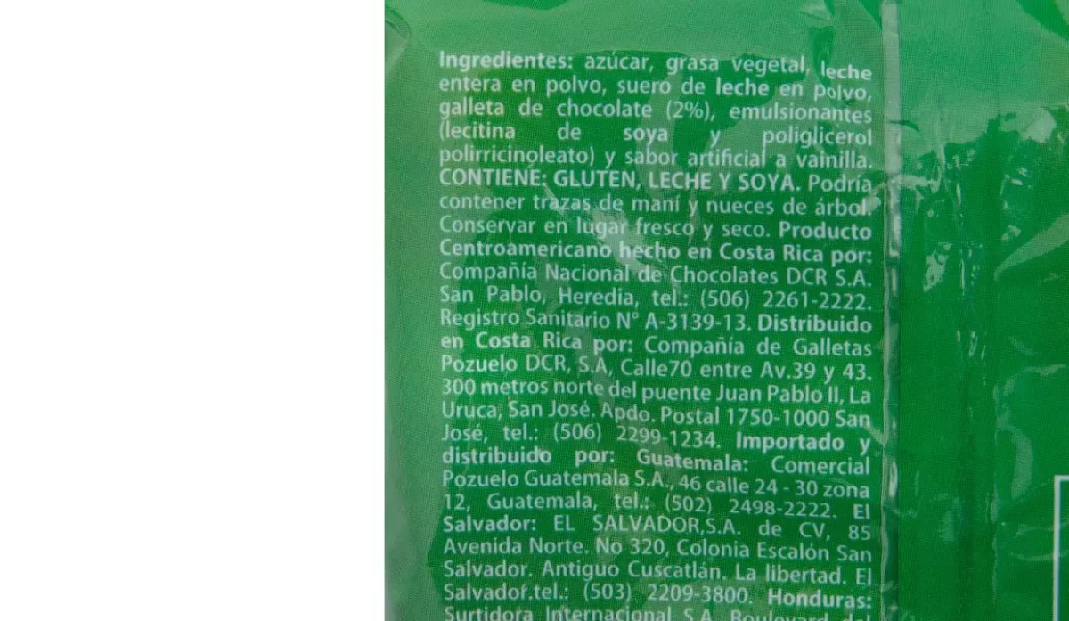 - Azúcar, grasa vegetal, leche entera en polvo, suero de leche en polvo, galleta de chocolate (2%), emulsionantes (lecitina de soya y poliglicerol polirricinoleato), sabor artificial a vainilla.