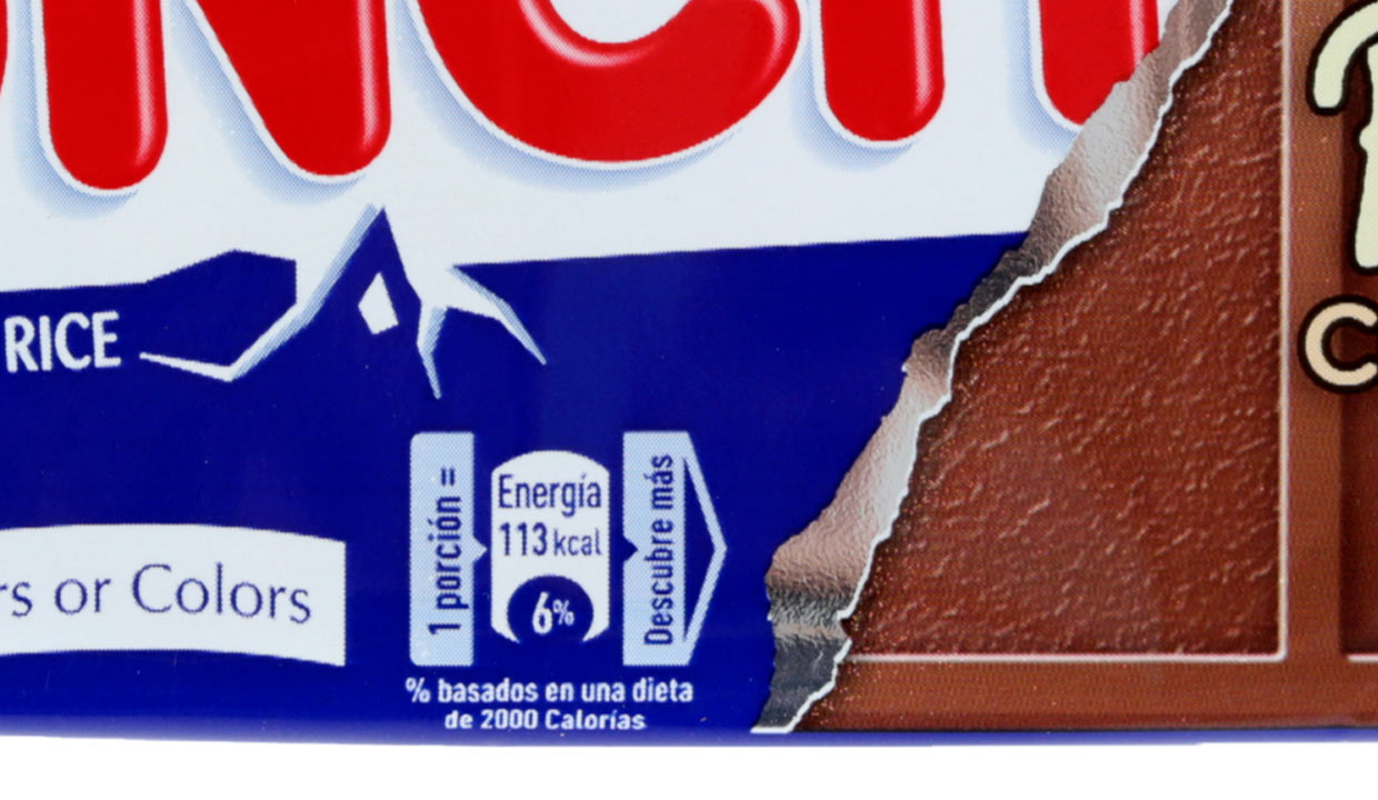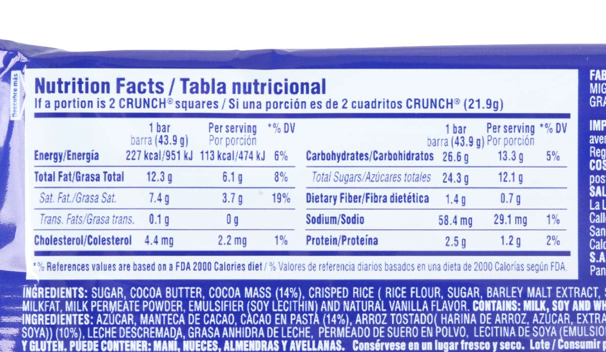 - Azúcar, manteca de cacao, cacao en pasta, arroz tostado, leche descremada, grasa anhidra de leche, suero en polvo y lecitina de soya.