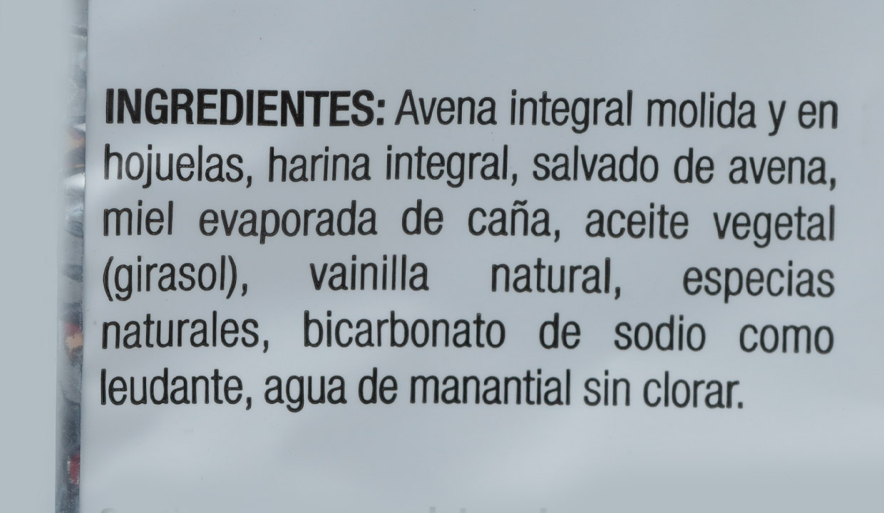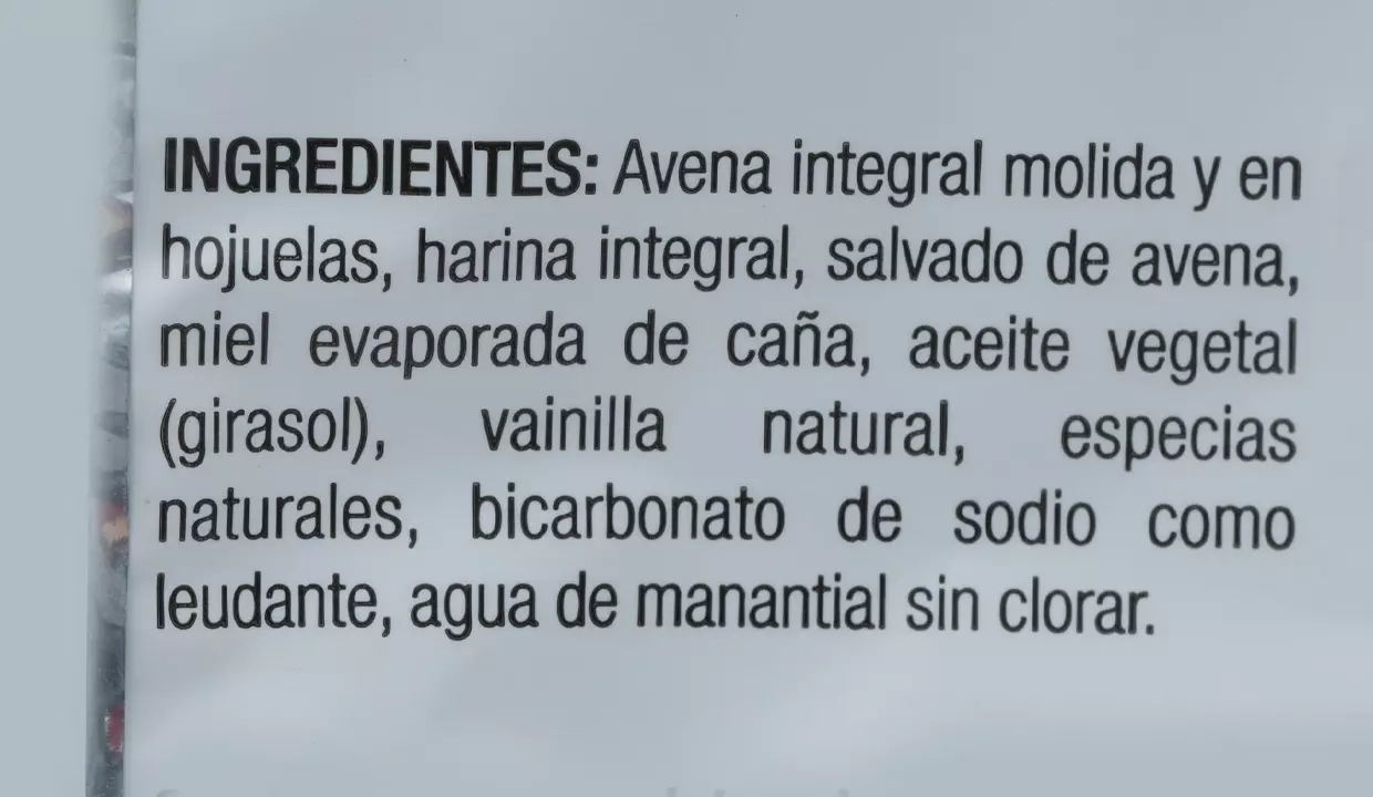 - Avena integral molida y en hojuelas, harina integral, salvado de avena, miel evaporada de caña, aceite vegetal (girasol), vainilla natural, especias naturales, bicarbonato de sodio como leudante y agua de manantial sin clorar.