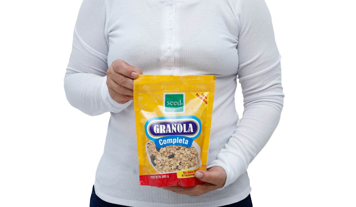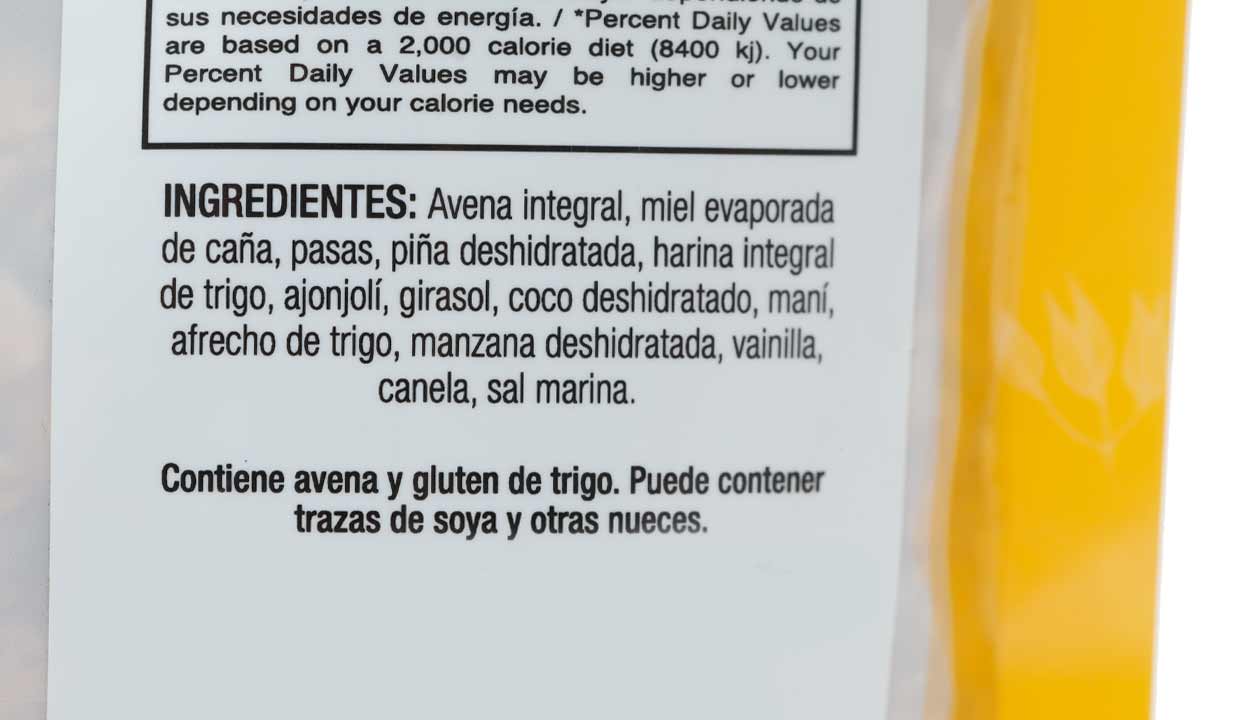 - Avena integral, miel evaporada de caña, pasas, piña deshidratada, harina integral de trigo, ajonjolí, girasol, coco deshidratado, maní, afrecho de trigo, manzana deshidratada, vainilla, canela y sal marina.