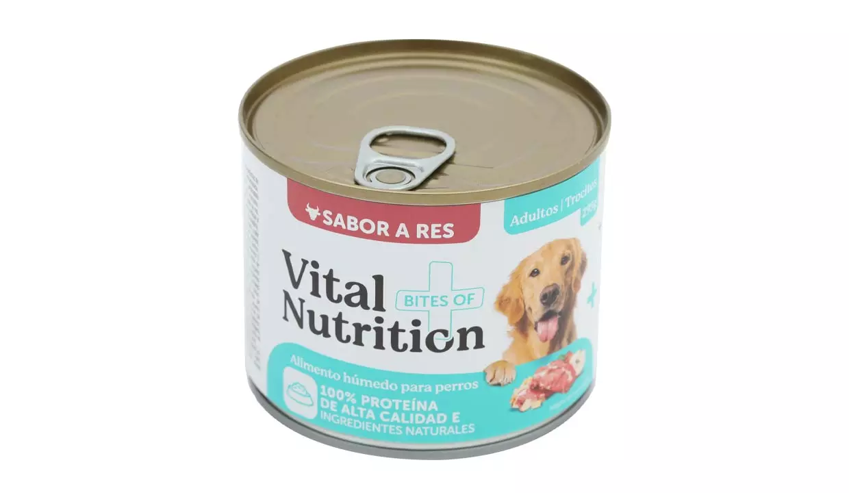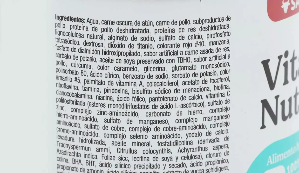 - Agua, carne oscura de atún, carne de pollo, subproductos de pollo, proteína de pollo deshidratada, proteína de res deshidratada, lignocelulosa natural, alginato de sodio, sulfato de calcio, pirofosfato tetrasódico, destrosa, dióxido de titanio, colorante rojo #40, manzana fosfato de almidón hidroxipropilado, sabor artificial a carne asada de res, sorbato de potasio, aceite de soya preservado con TBHQ, sabor artificial a pollo, cúrcuma, color caramelo, glicerina, glutamato monosódico, polisorbato.