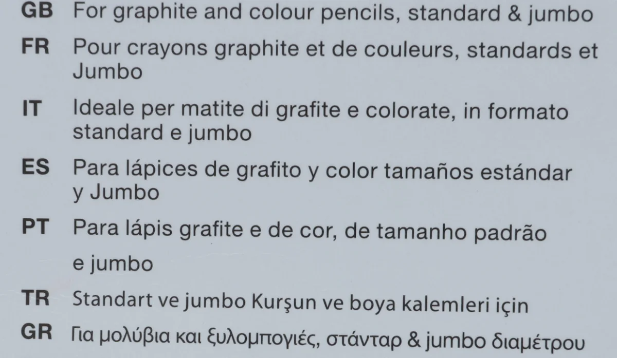 - Para lápices de grafito y de color, tamaños estándar y jumbo.