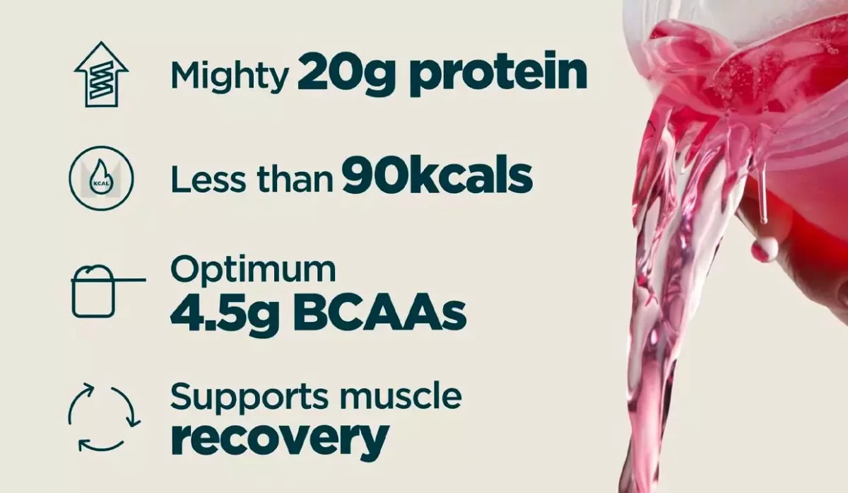- Aislado de proteína de lactosuero hidrolizada (leche) (93%), contiene antiespumante (dióxido de silicio), aceite de colza, aromas naturales, ácido (ácido cítrico), colorante (rojo remolacha), edulcorante (sucralosa).