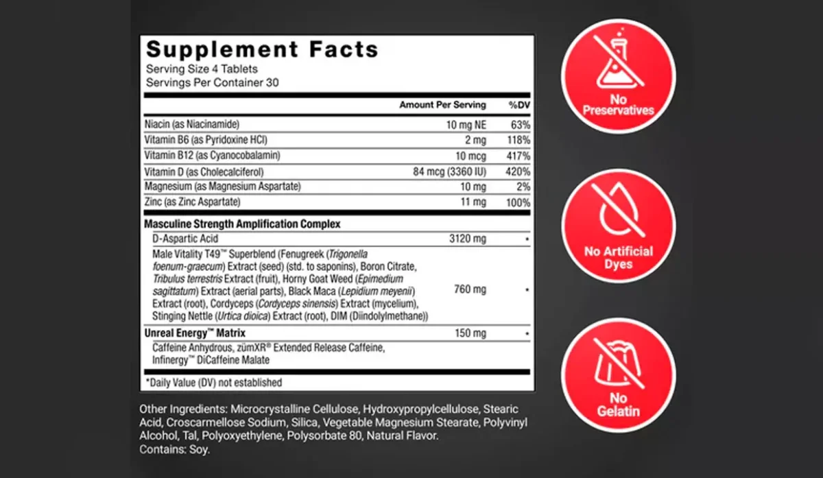 - Cada porción contiene 3,120 mg de ácido D-aspártico, un aminoácido que ha mostrado en estudios clínicos aumentar los niveles de testosterona en hasta un 50% en 12 días.