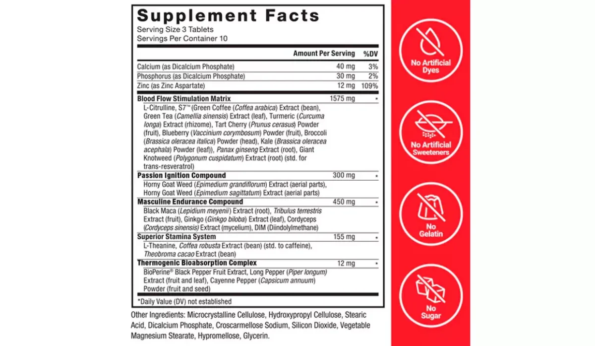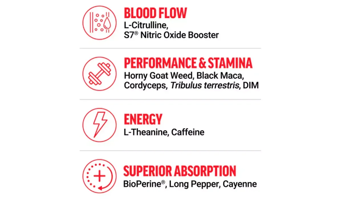 - Su fórmula incluye L-citrulina y la mezcla S7 para aumentar los niveles de óxido nítrico (NO), lo cual favorece vasodilatación y un mejor flujo sanguíneo.