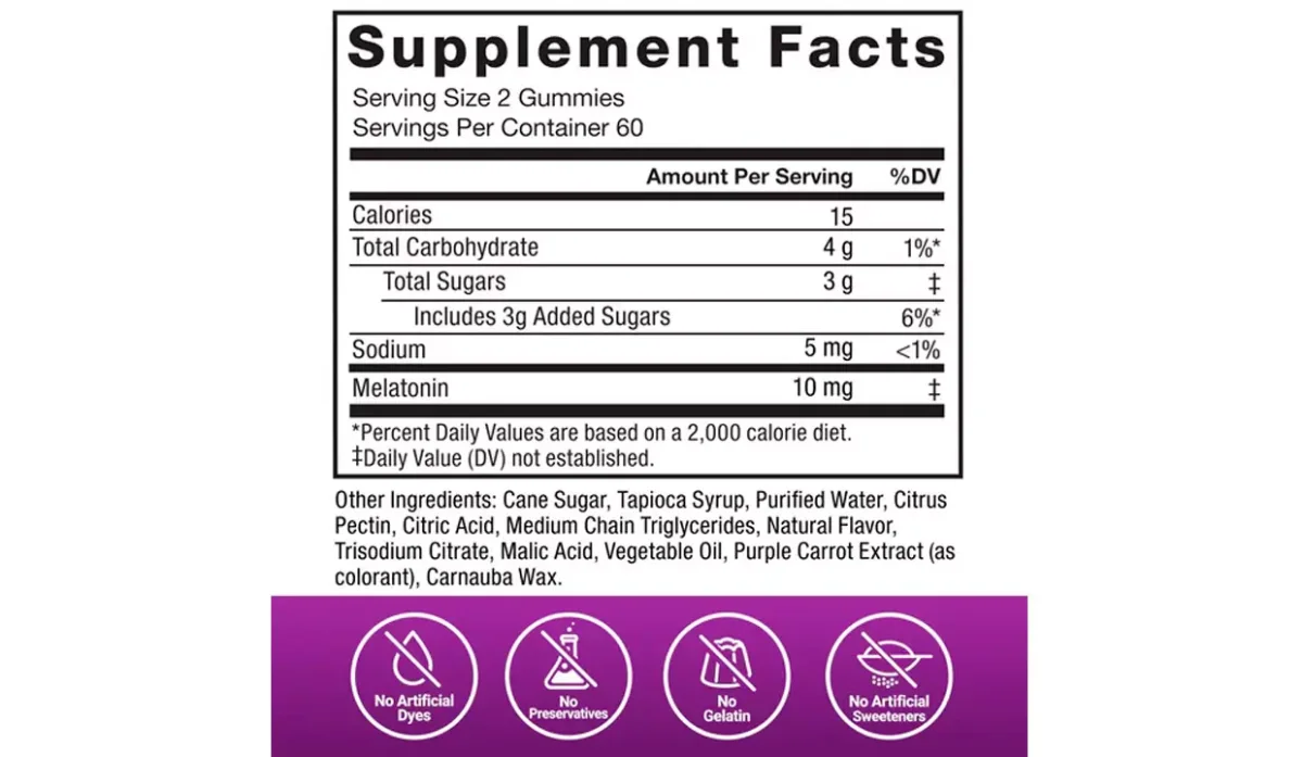 - Aportan 10 mg de melatonina, con el fin de ayudar a regular el ritmo circadiano y facilitar el sueño.