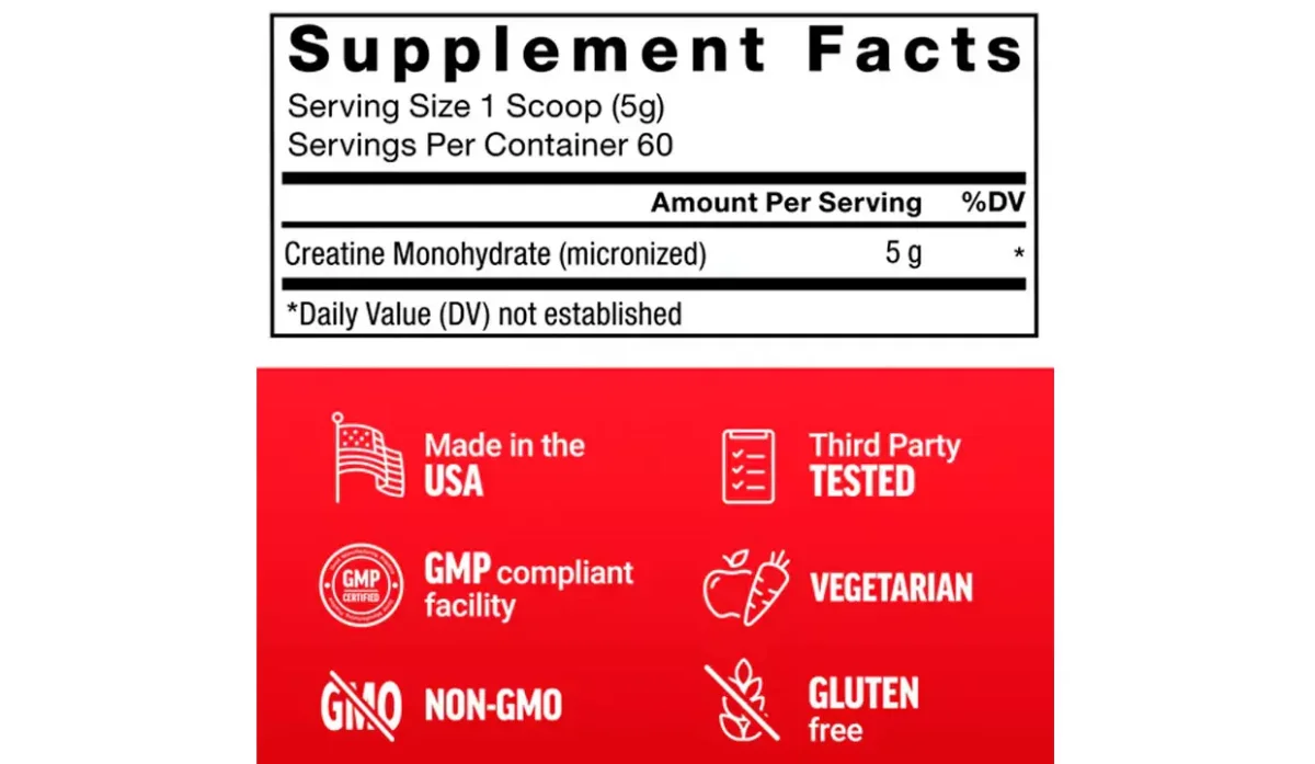 - Cada porción contiene 5 gramos de creatina monohidratada, una cantidad respaldada por estudios científicos para mejorar la fuerza, la resistencia y el rendimiento atlético.