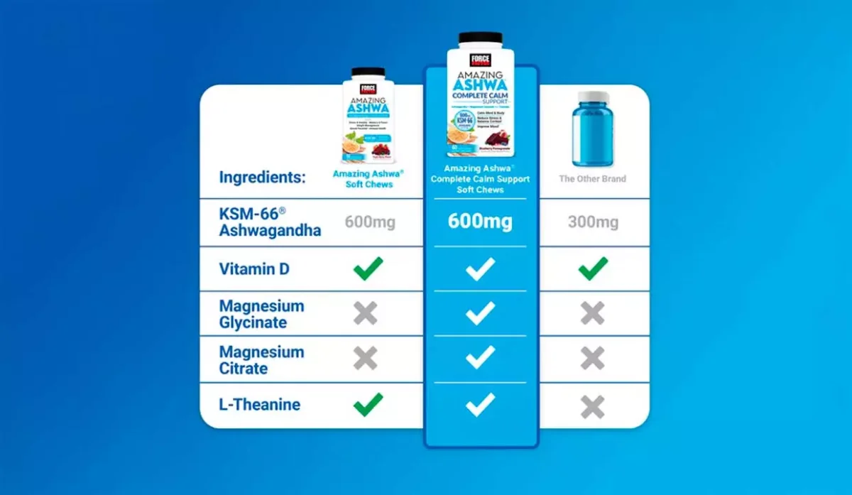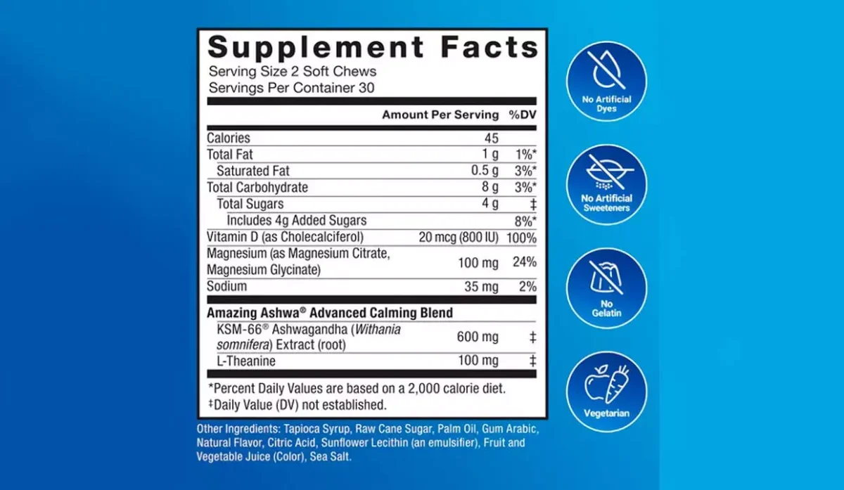 - Además de la Ashwagandha, estas masticables incluyen vitaminas B6 y B12 para aumentar la energía y reducir la fatiga, vitamina D para apoyar la función inmunológica, y una mezcla de superalimentos como bacopa monnieri, maca, panax ginseng, L-teanina y extracto de té verde.
