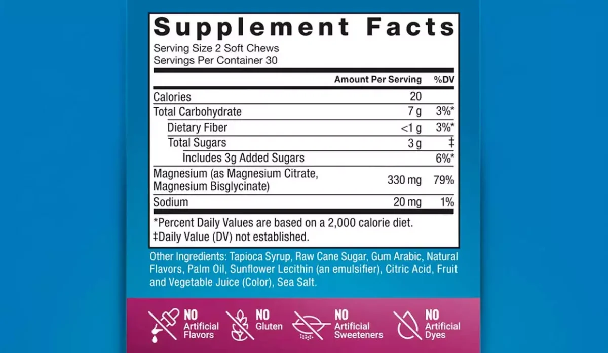 - Cada porción proporciona 330 mg de magnesio en forma de glicinato y citrato, dos de las formas más biodisponibles del mineral, que ayudan a calmar la mente y relajar el cuerpo.