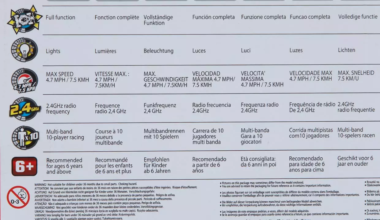 - Diseñado con tecnología de transmisión de 2,4 Ghz que permite una diversión sin interferencias y un máximo de 10 jugadores compitiendo a la vez.