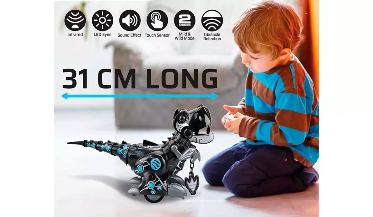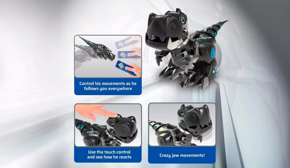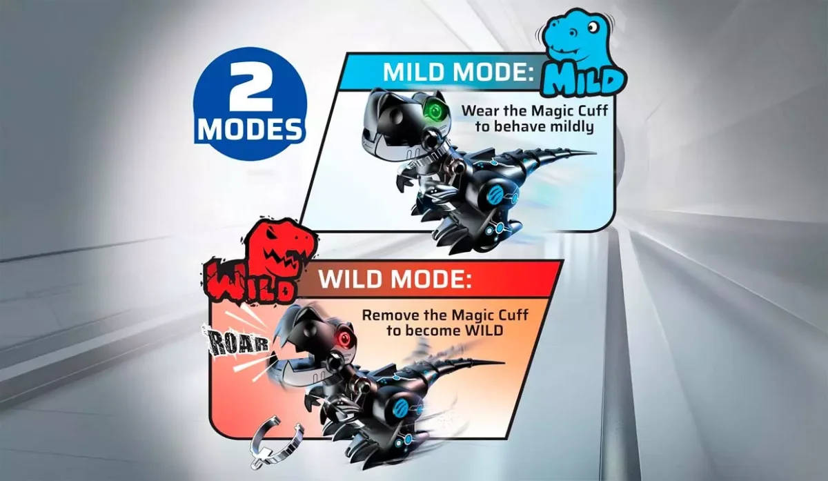 - Cuenta con 2 modos de juego: salvaje, persigue y ruge fuerte o dócil, se comporta de forma dulce.