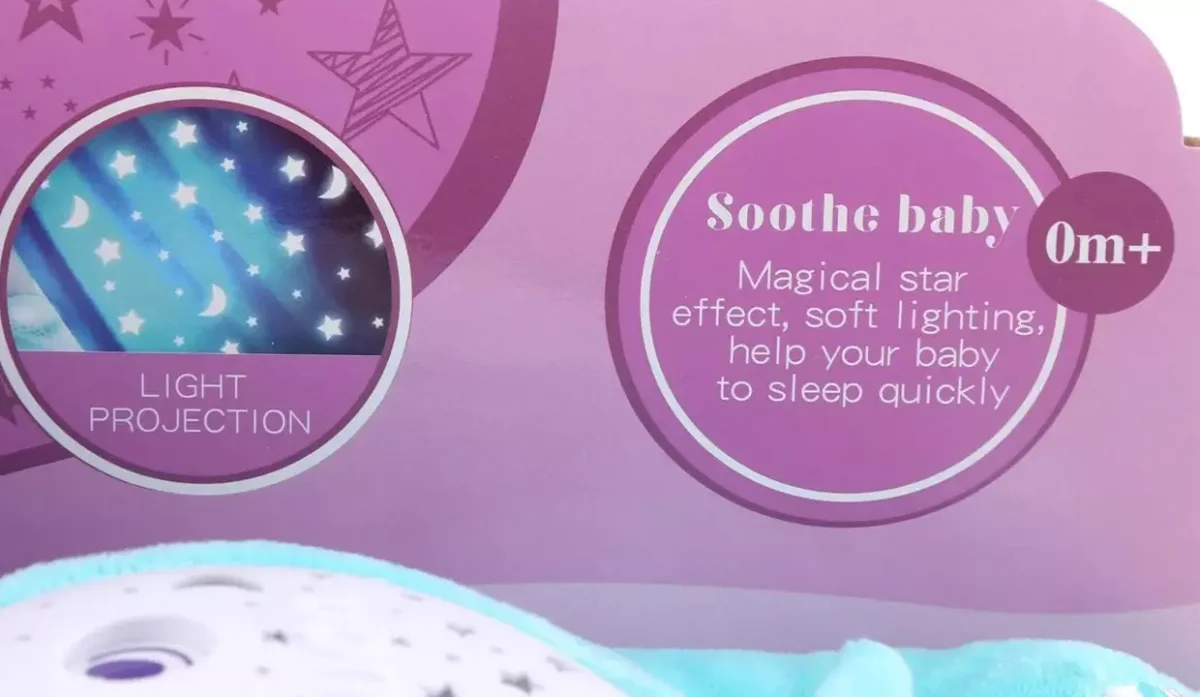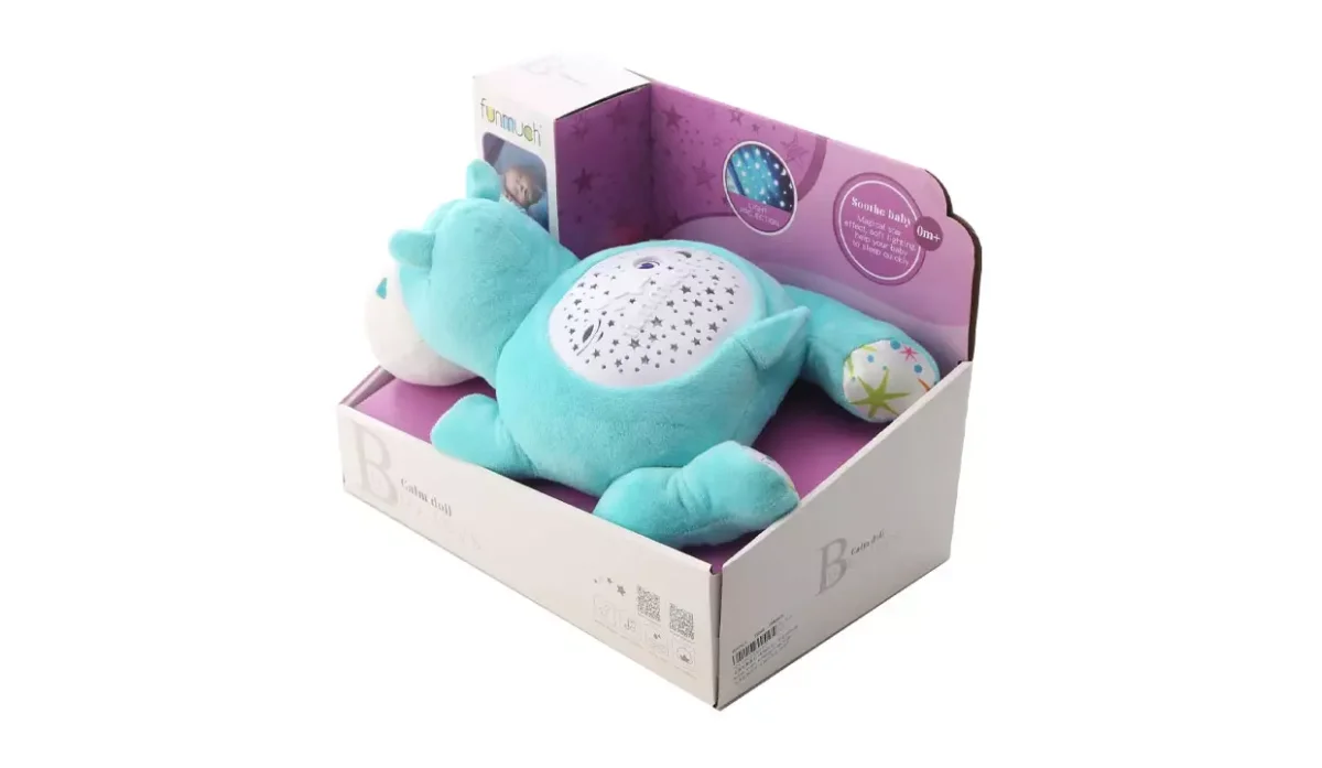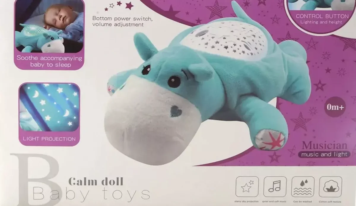 - Suave peluche de hipopótamo con proyector de luz en forma de estrellas.