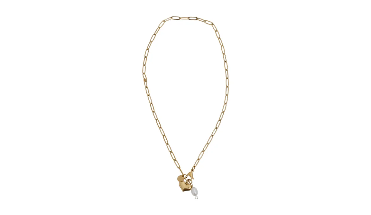- Cadena de latón baño de oro 18, cadena de acero y dijes de latón baño de oro y acero.