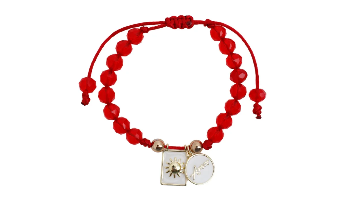 - Hilo chino y cola de ratón, cristales sintético dijes (acero y latón en baño de oro de 14).