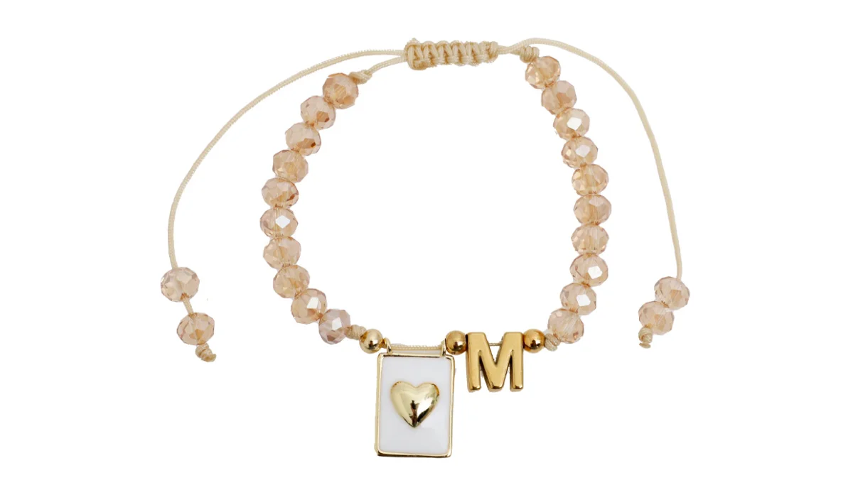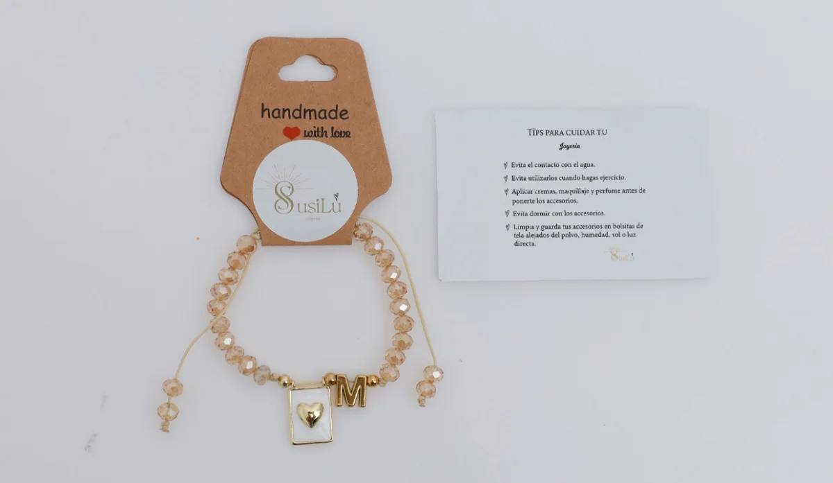 - Con piedras decorativas y dijes de corazón y letra "M".