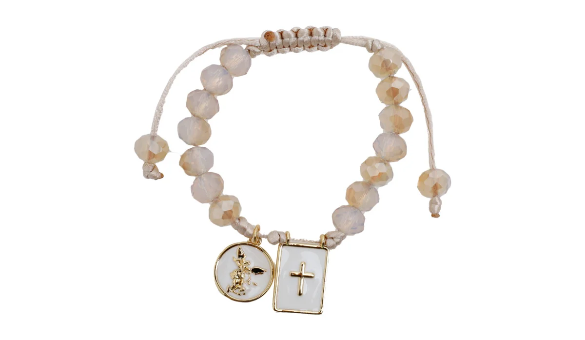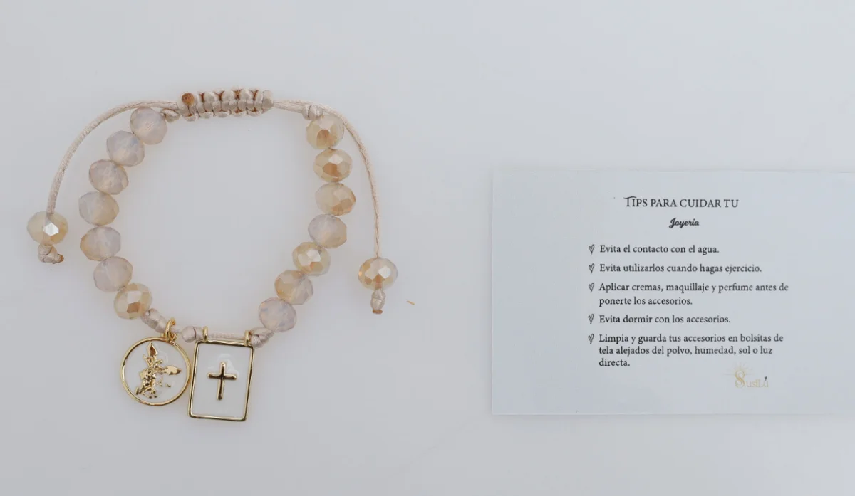 - Hilo chino y cola de ratón, cristales sintético dijes (acero y latón en baño de oro de 14).